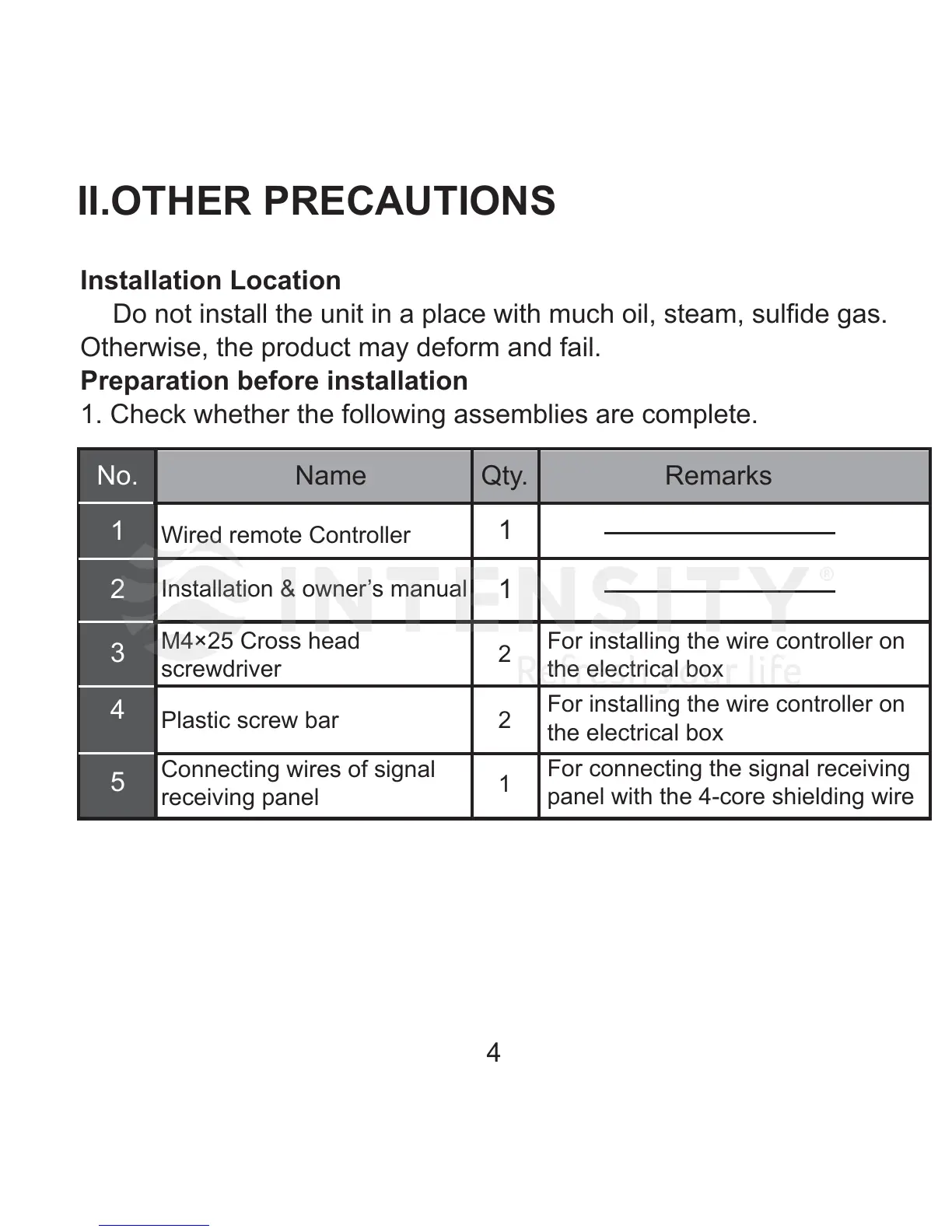 Do not install the unit in a place with much oil, steam, sulfide gas.