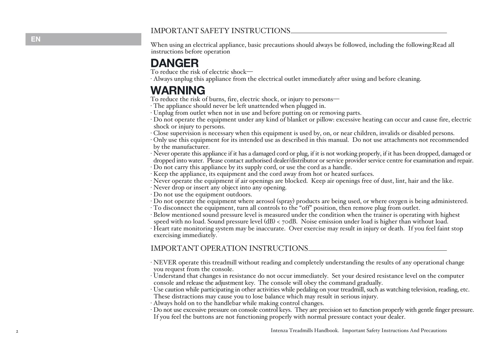Intenza Treadmills Handbook. Important Safety Instructions And Precautions