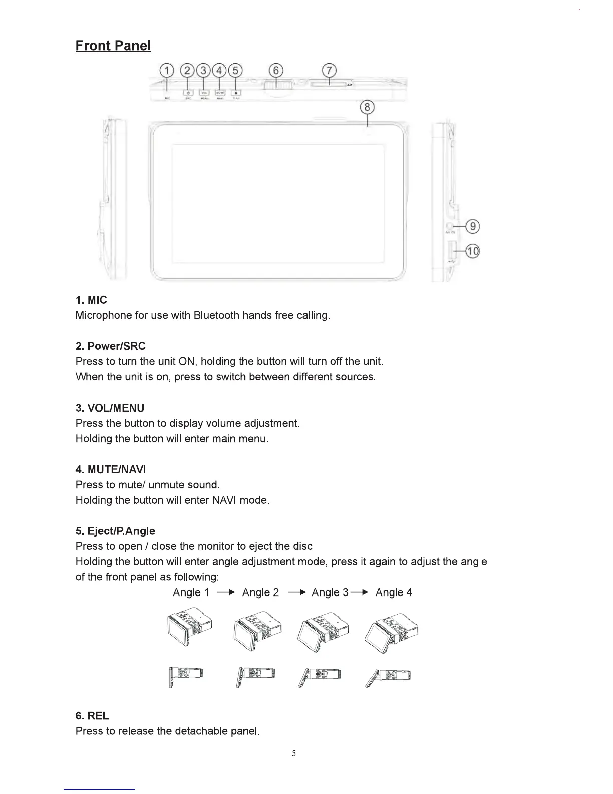 Inteq Car multimedia system - Front Panel; MIC; Power;SRC; VOL;MENU