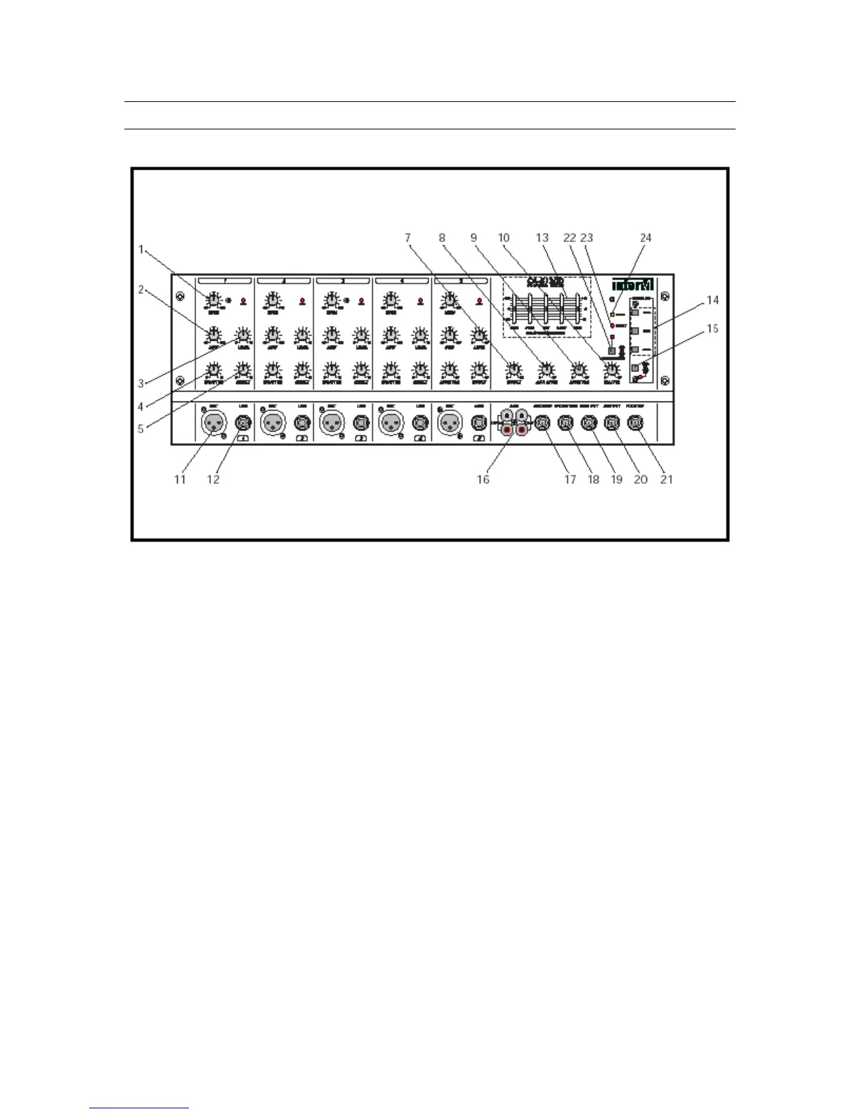 sent to the Monitor Output jacks (19). The Monitor buss signal is pre-fader, and is