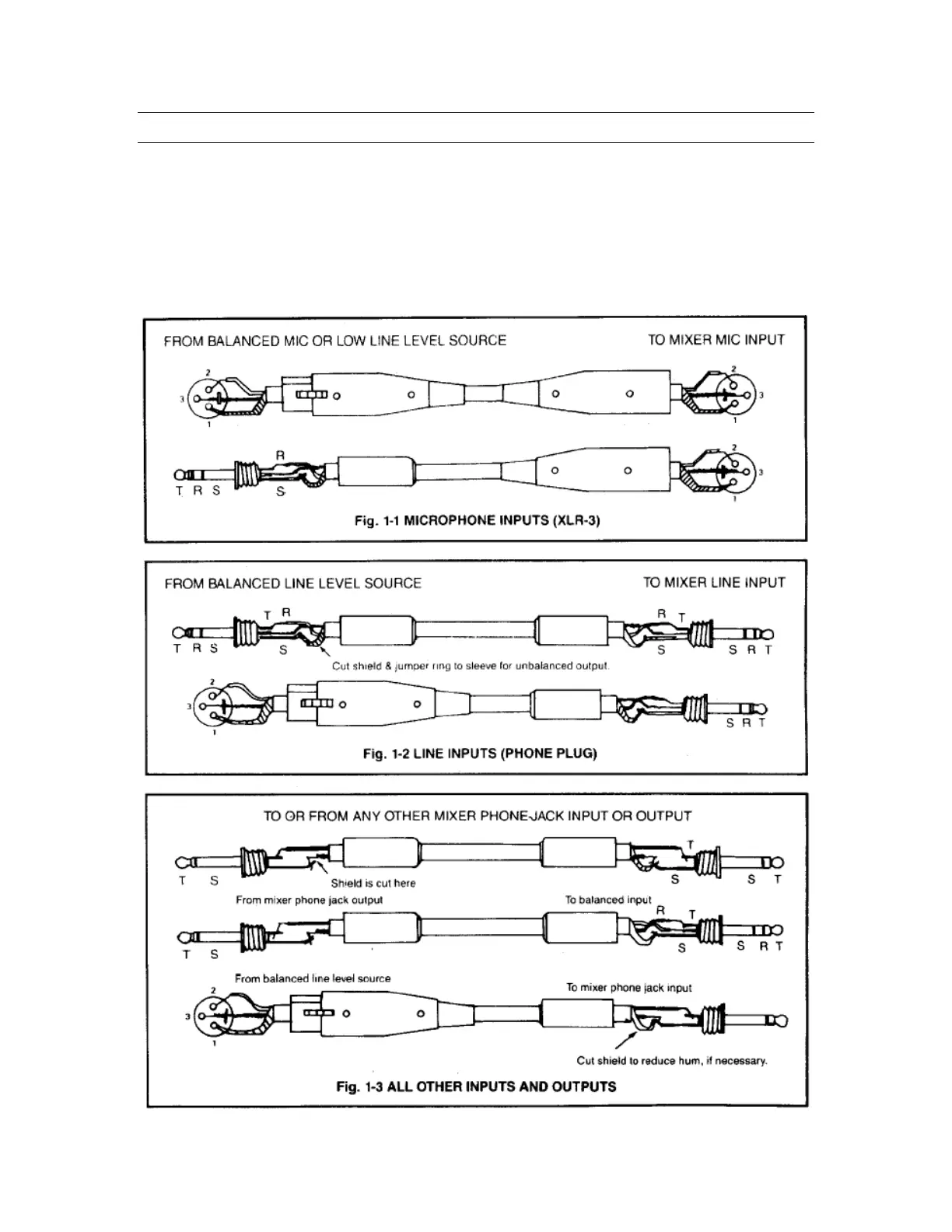 audio connectors; 3-pin female XLR, 1-conductor (tip-sleeve) 1/4” phone jacks, and 2-