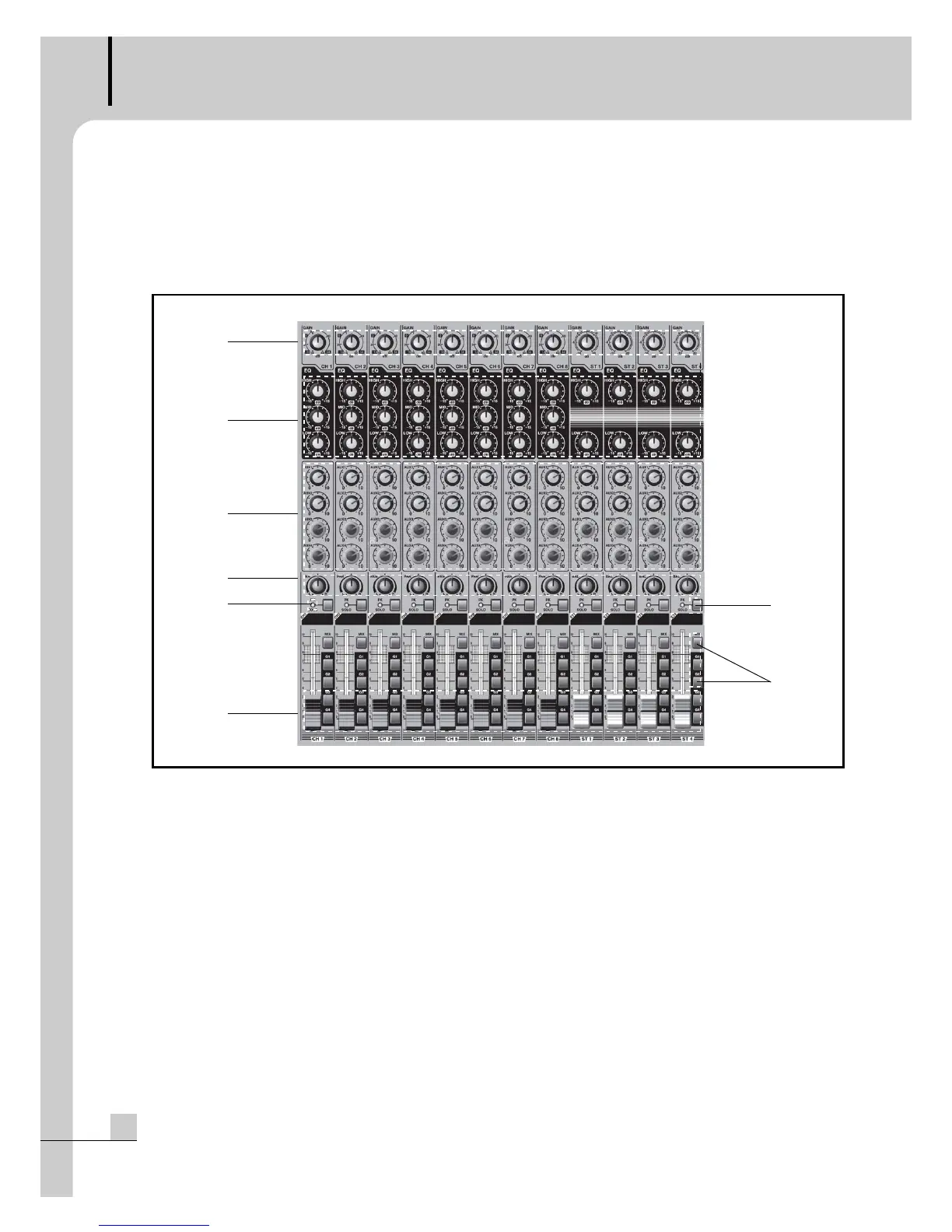 The equalizer section provided on each input channel consists of HIGH, MID, and LOW controls at the