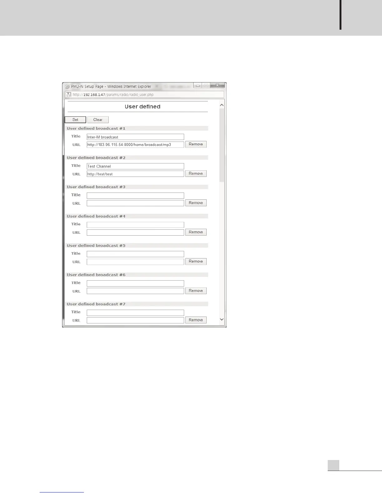Type the title and URL of desired station then click the set button to finish. Up to 20 channels can be added