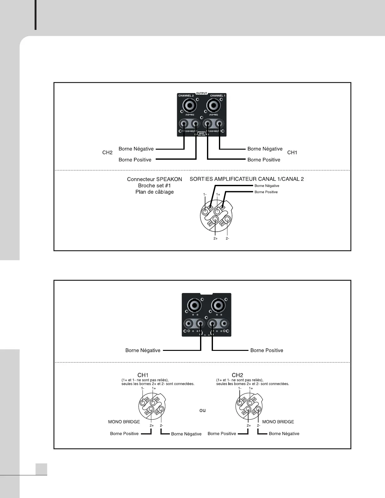 Mode mono utilisant les 2 bornes (+) des 2 canaux. Les bornes négatives (-) ne sont pas utilisées.