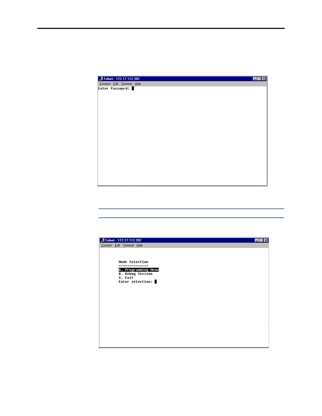 2. Establish a Telnet connection to the IPRC’s IP address using a Telnet program (such as