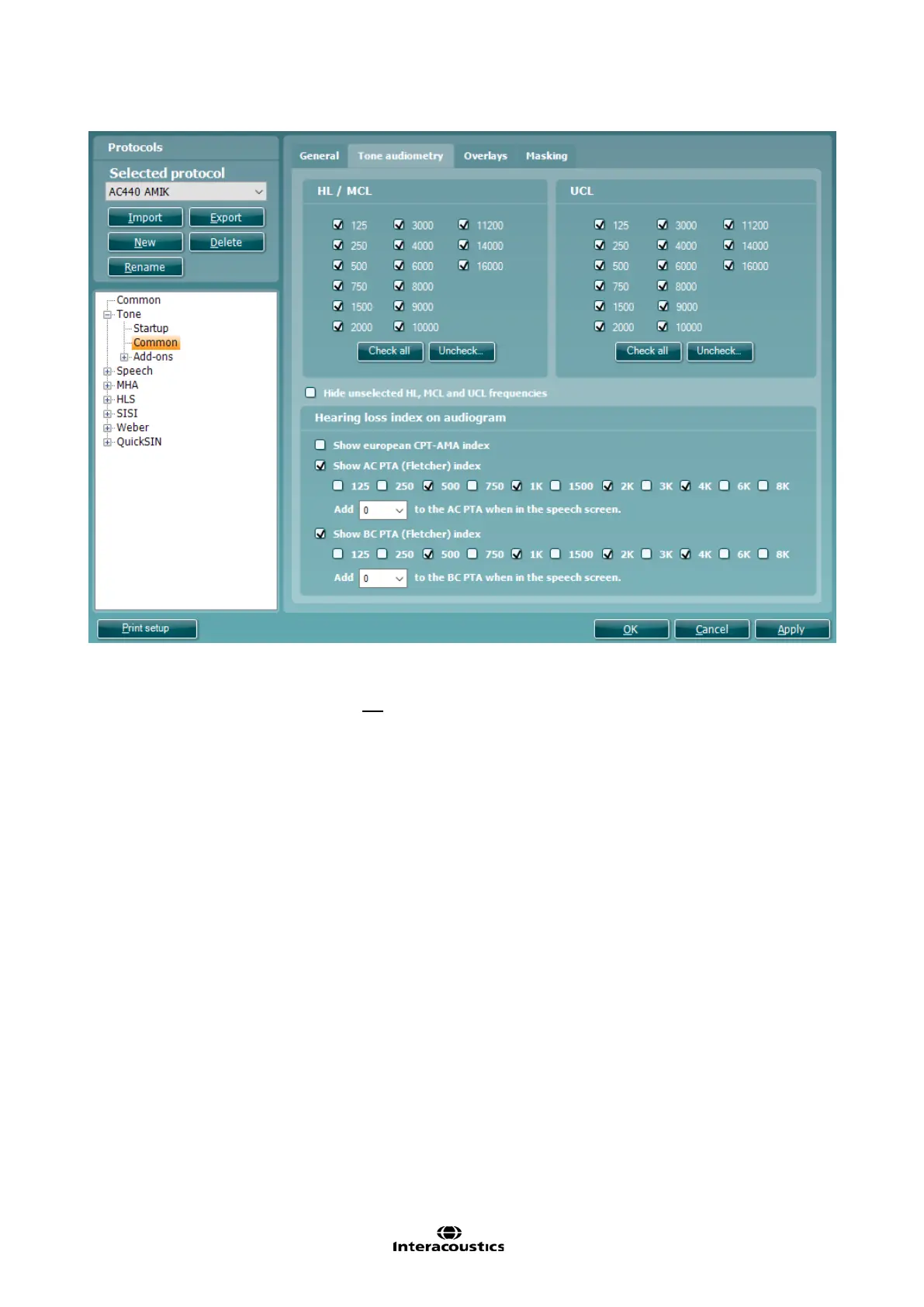 17) Under the Tone audiometry tab you can select the desired test frequencies for HL/MCL and UCL by