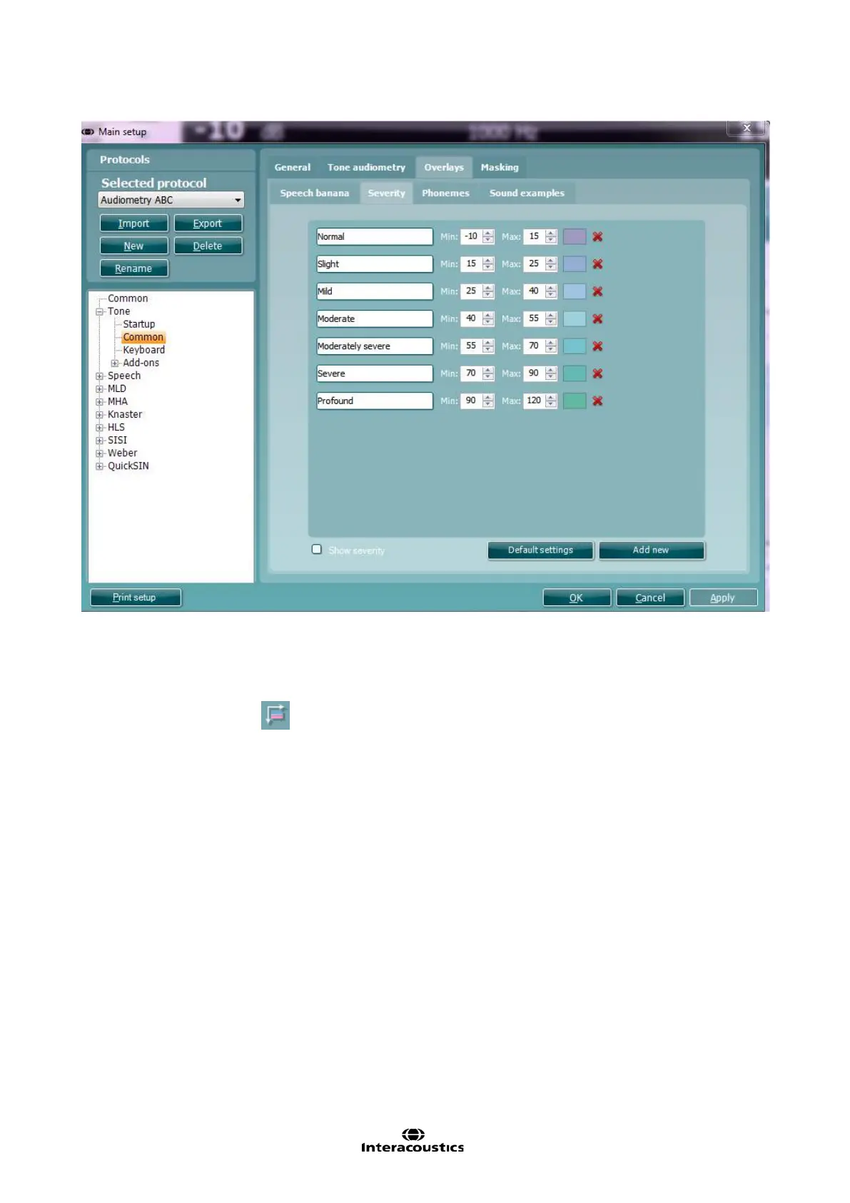 21) A Severity indication can be set up by defining the label, minimum and maximum dB and colour for