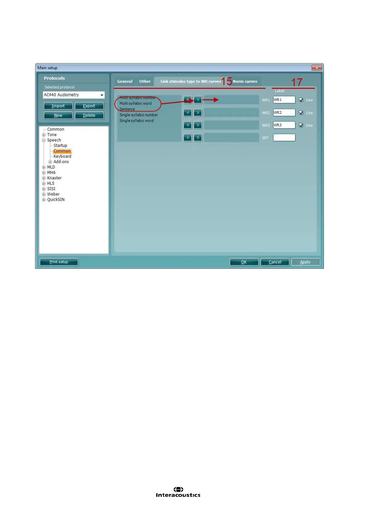Under the Link stimulus to WR curve tab a certain type of speech material can be linked to the