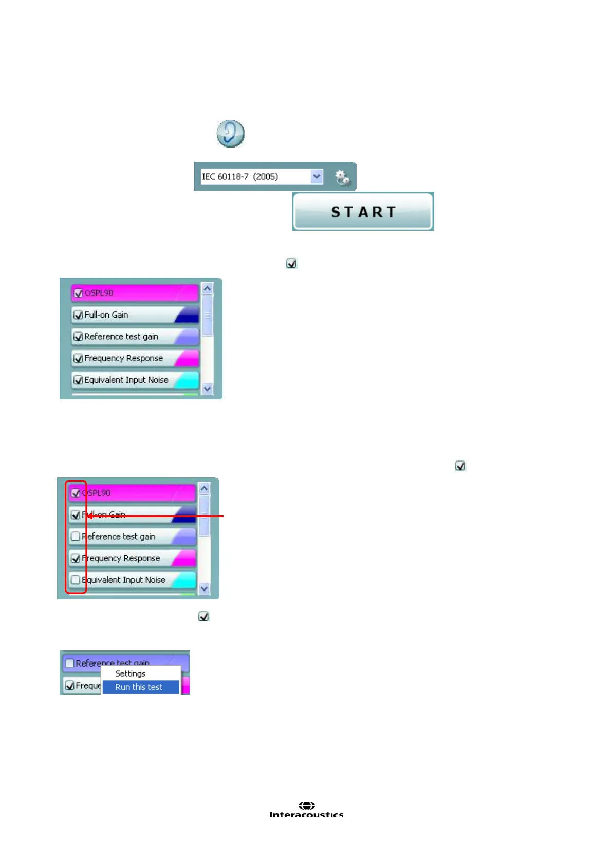 ONLY the tests marked with a will be performed when pressing START. To run the remaining tests these