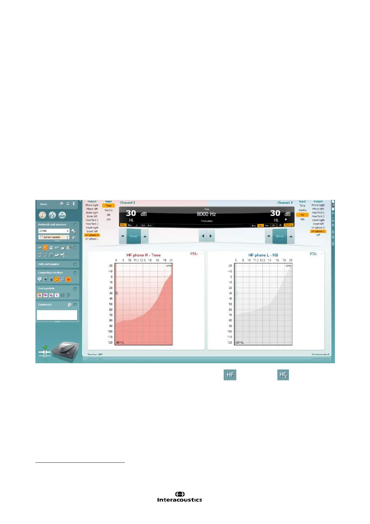3) To perform a high frequency audiometry, press the HF button
