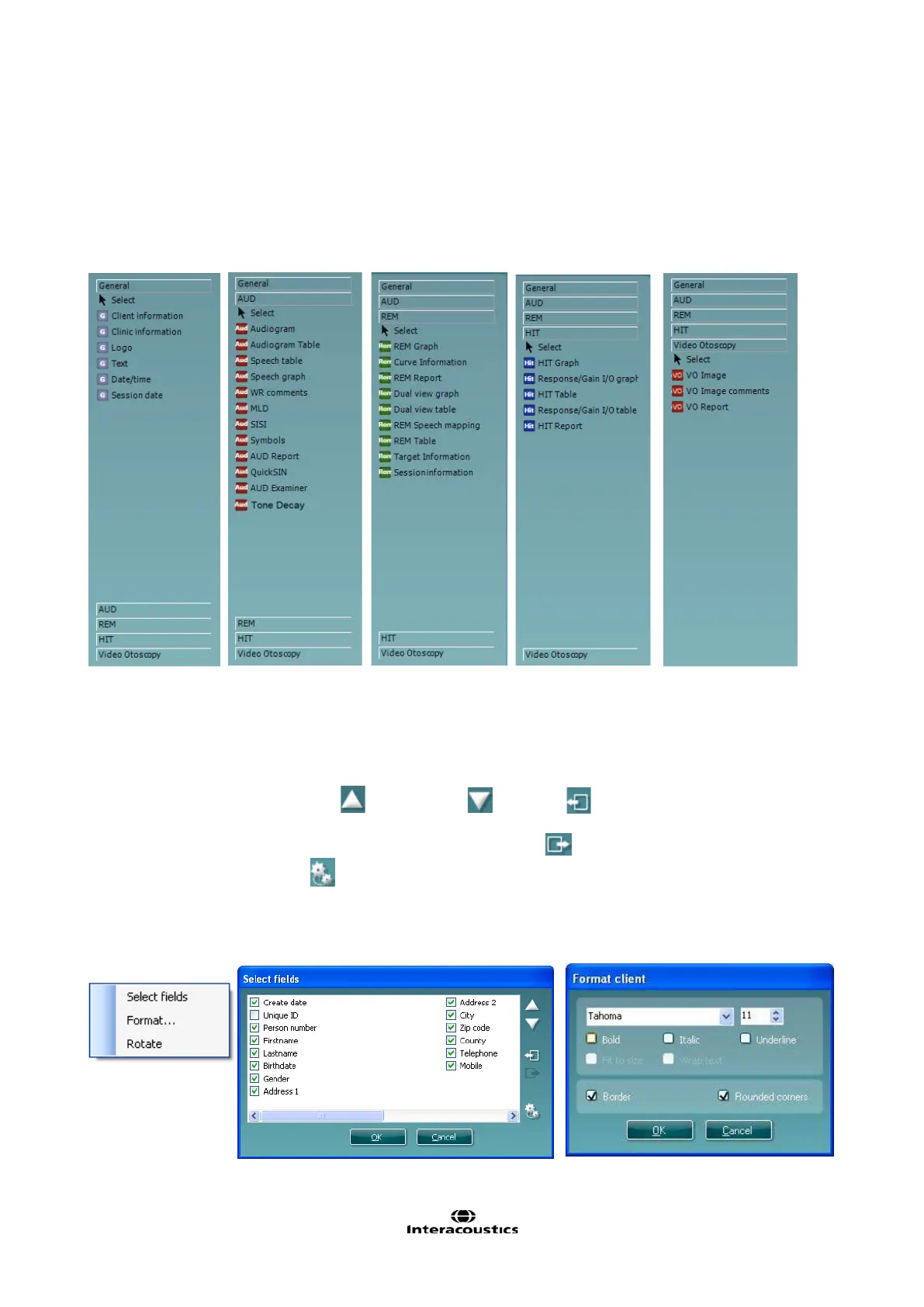 The following elements are available for the AUD, REM,HIT and Video Otoscopy modules. The section