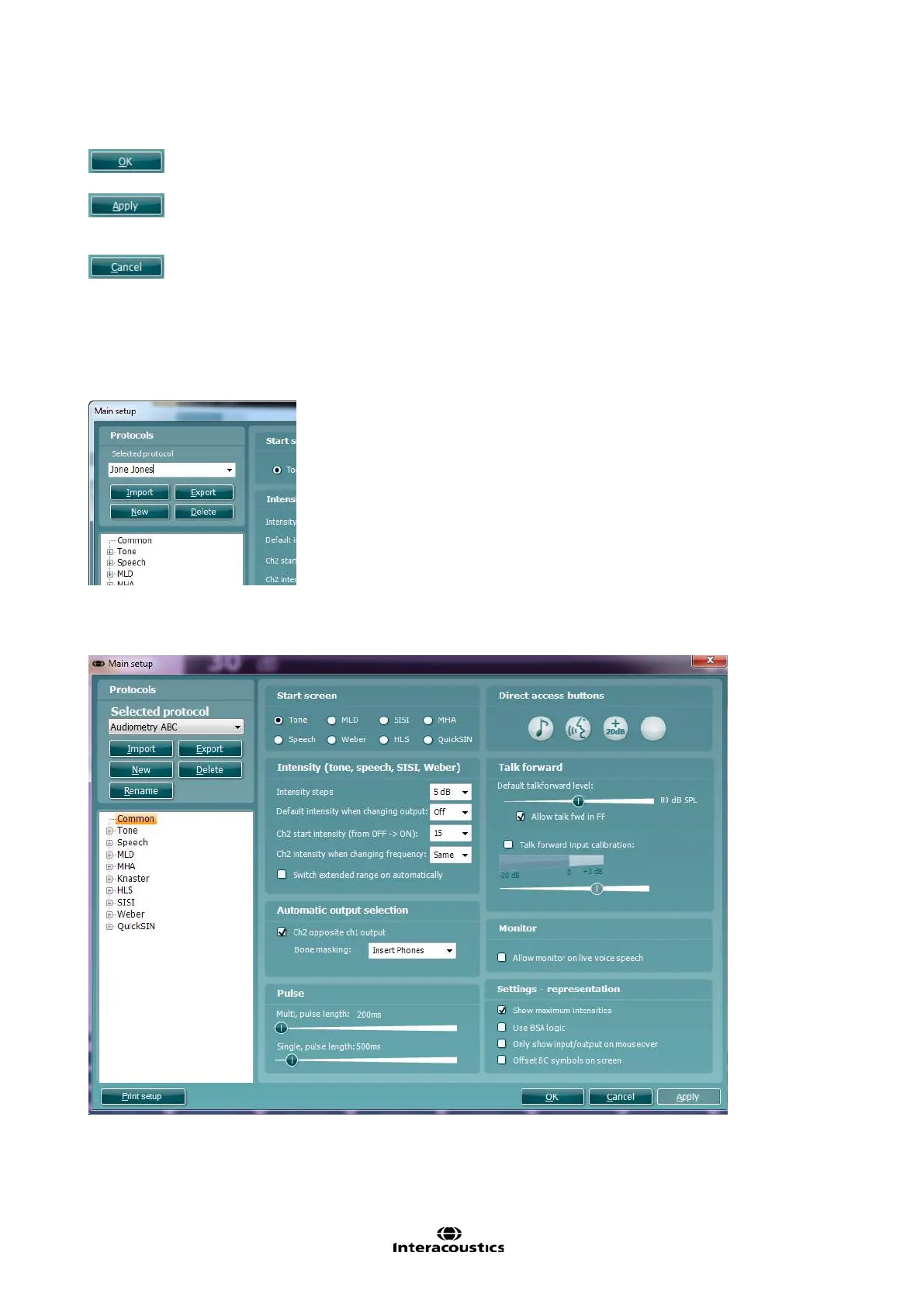 In each setup screen you will find three buttons in the lower right corner: