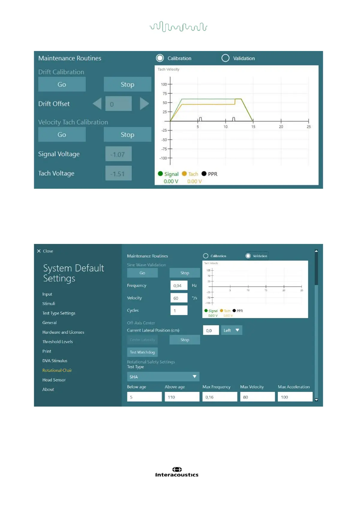 For testing otolith function, a 0 to 7 cm micro-centrifuge option is available. The chair seat should be