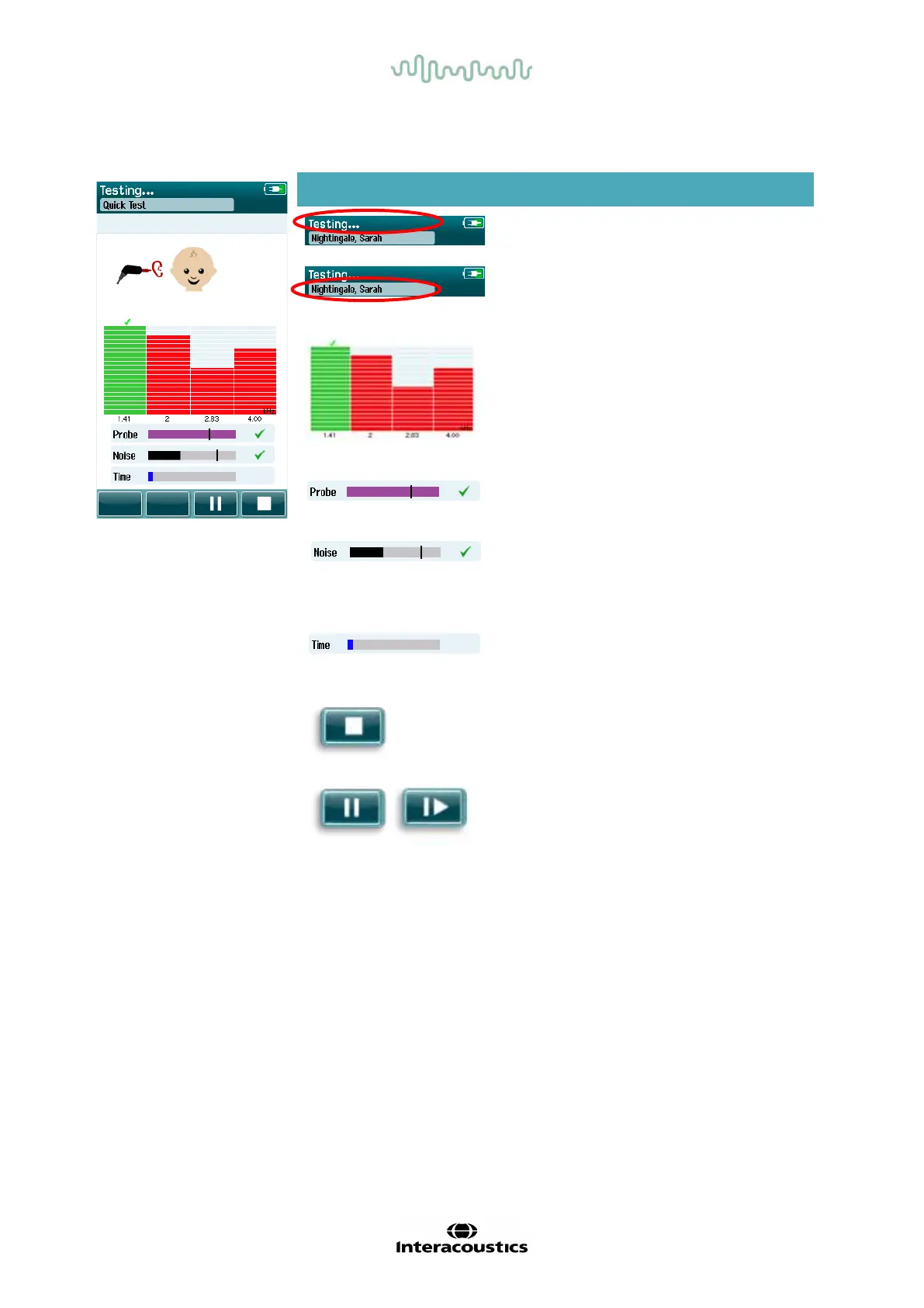 During testing, the Probe stability bar will ref lect the status of the probe in the ear canal. A checkmark will
