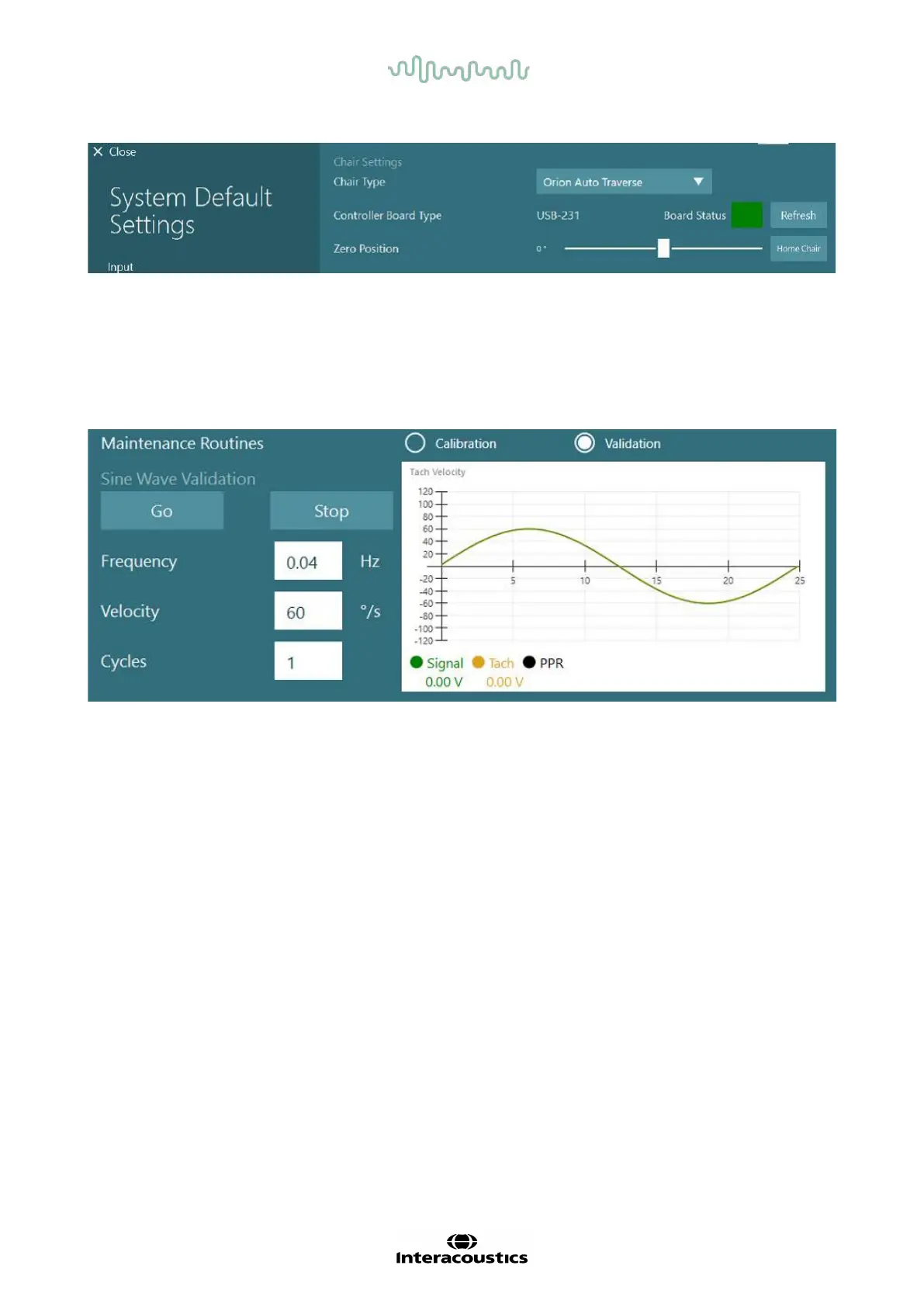Click Go on the Sine Wave Validation screen. The chair should rotate back and forth slowly. Watch the sine