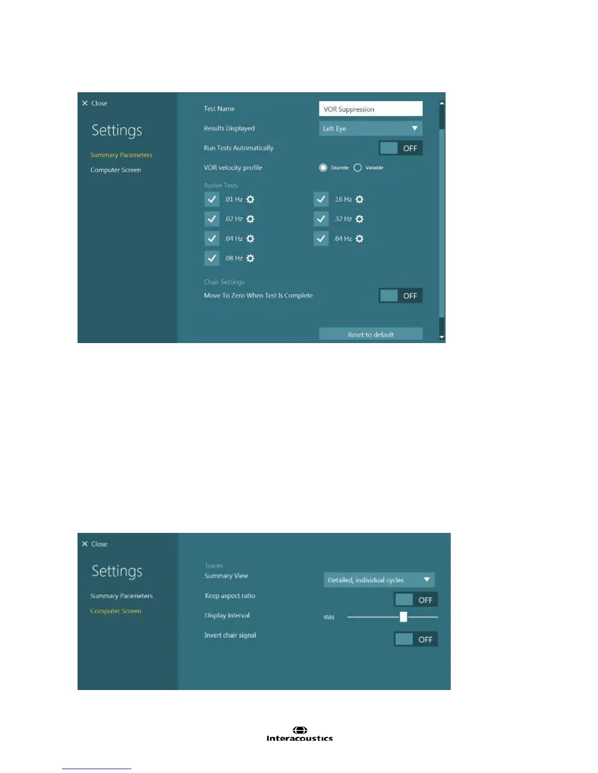 each test will open the subtest settings. The Nydiag 200 chair can test up to 0.32 Hz, and the Orion Reclining