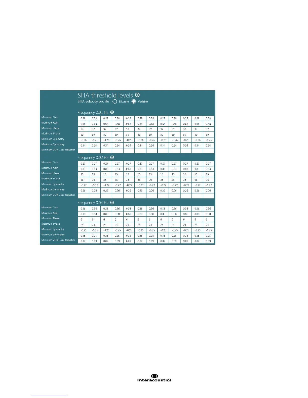 discrete velocity tests (based on 60 deg/sec for all frequencies) and variable velocity (increased velocity with