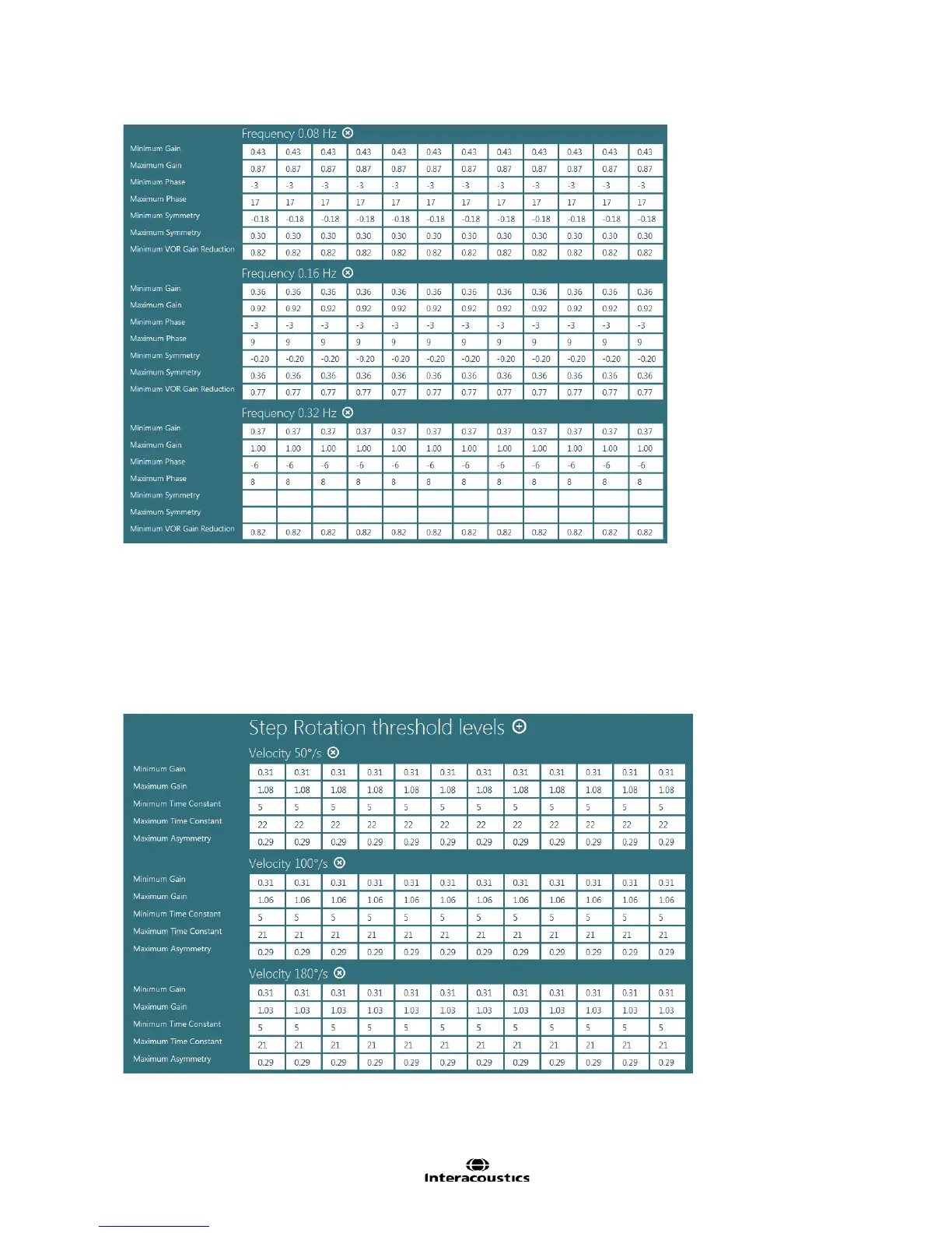 Step Rotation tests display threshold values for gain, time constants, and time constant asymmetry.