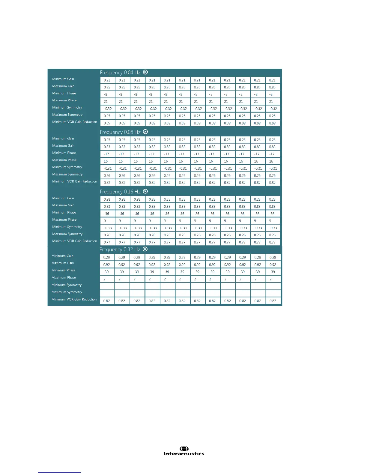 VOR Suppression Tests display threshold values for minimum gain reduction (%) for both discrete and