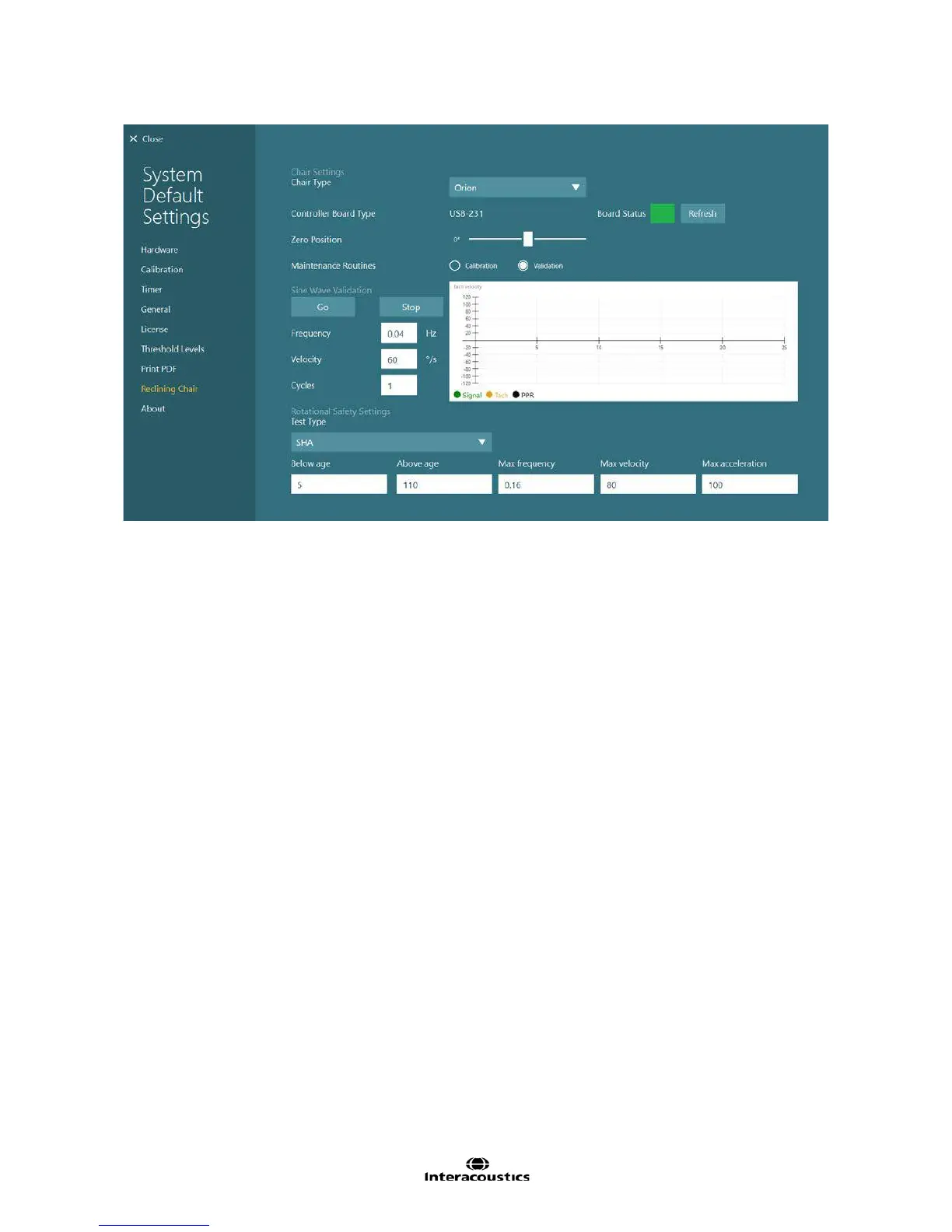 will stop the chair and update the signal and tach voltage values. Click or touch the Stop button to clear the