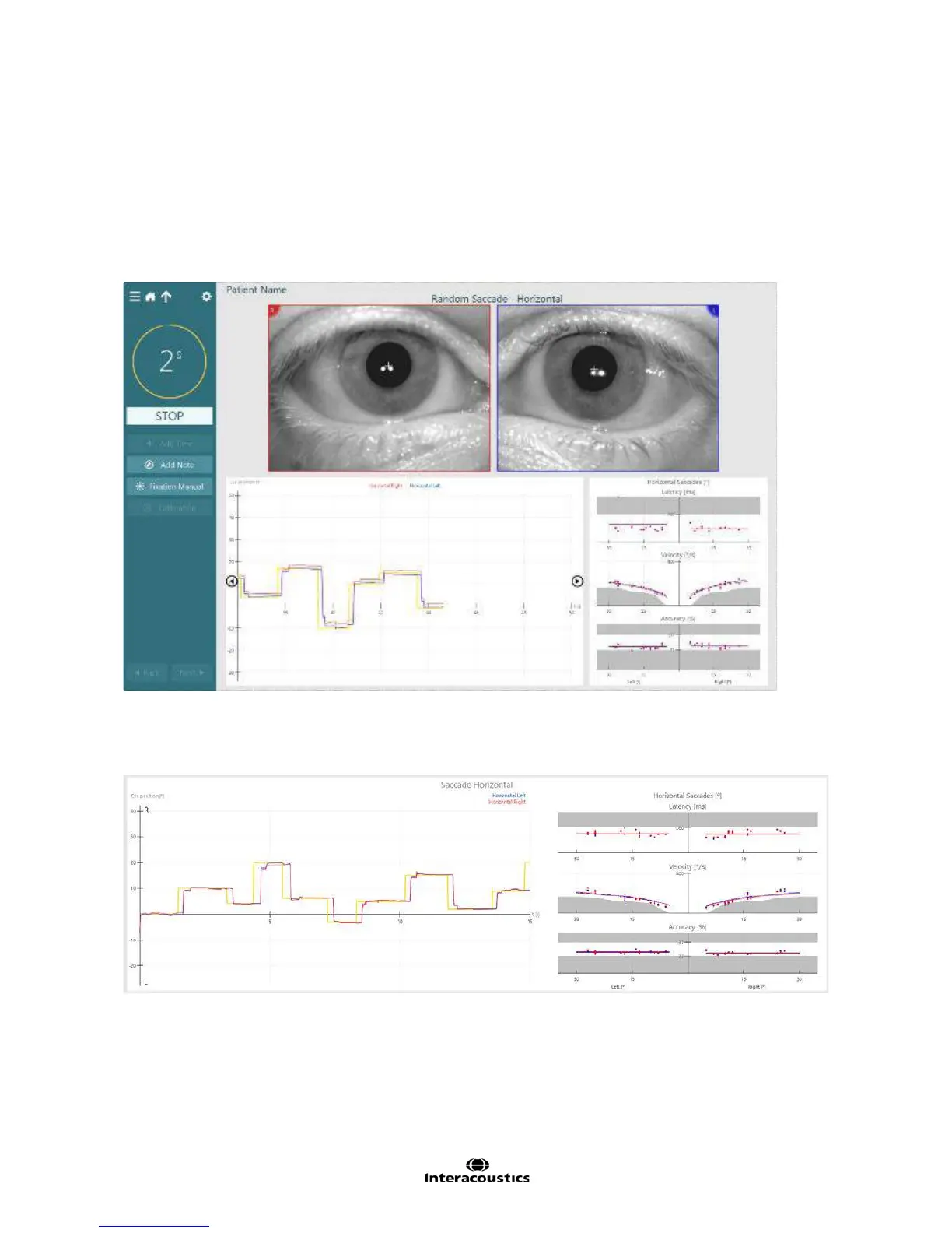 The saccades are automatically analyzed as the test is performed, and the results are displayed for latency,
