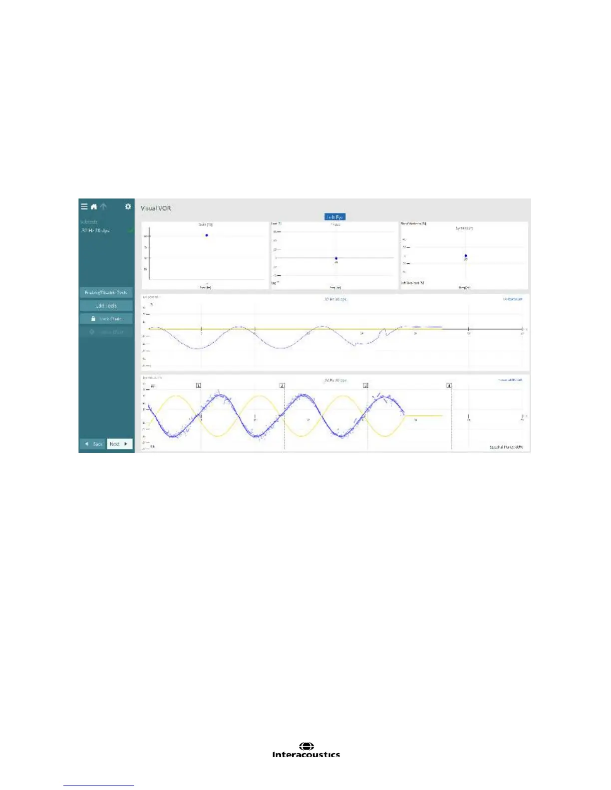 and opposite to the chair while he/she is focused on a stationary target. Visual VOR analysis is performed in