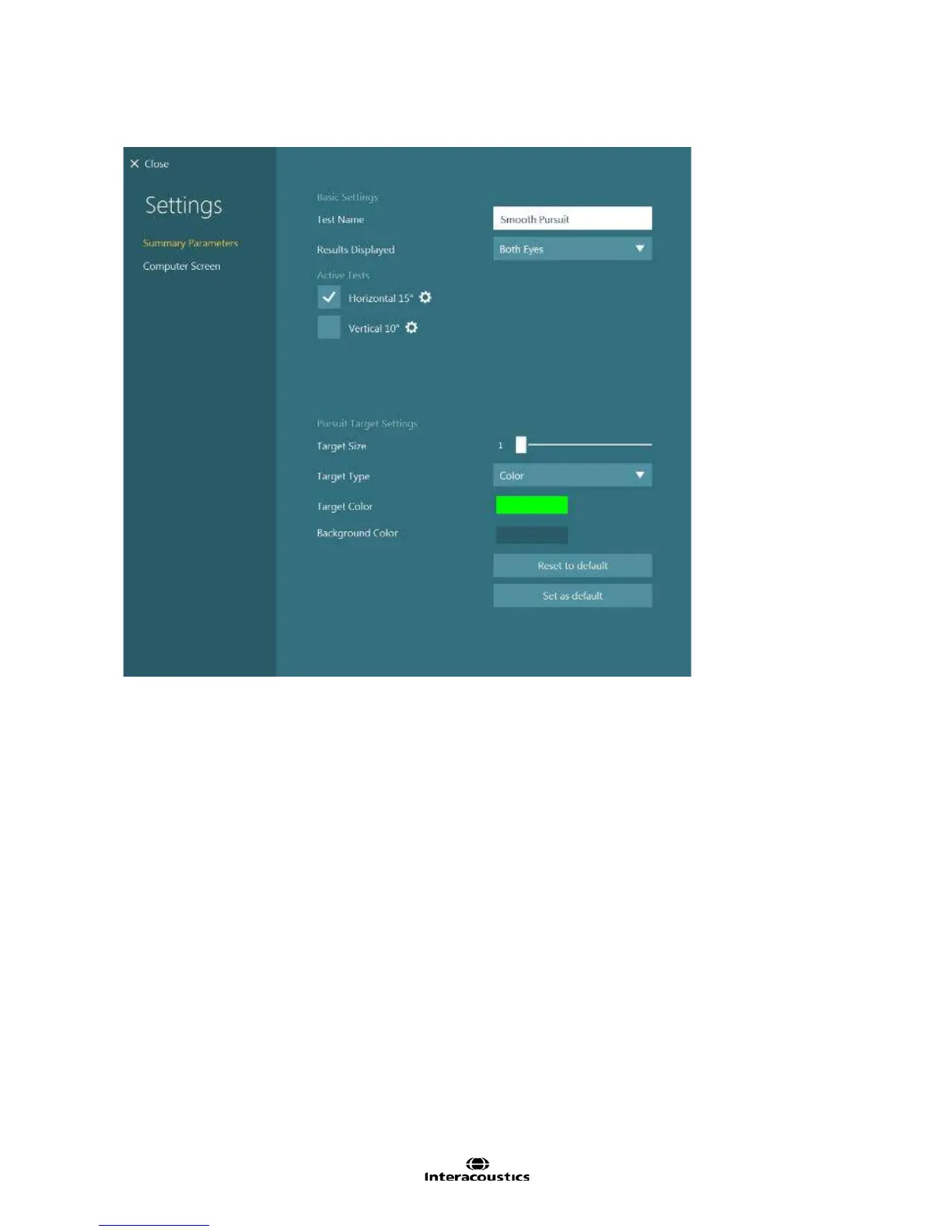 each test will open the subtest settings. Horizontal 15° is selected by default, and the clinician can choose to