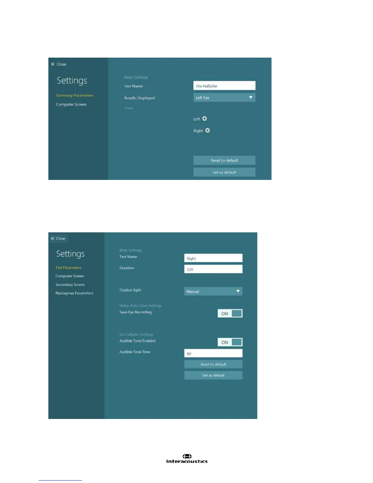 Figure 8.3.3 Dix Hallpike subtest settings