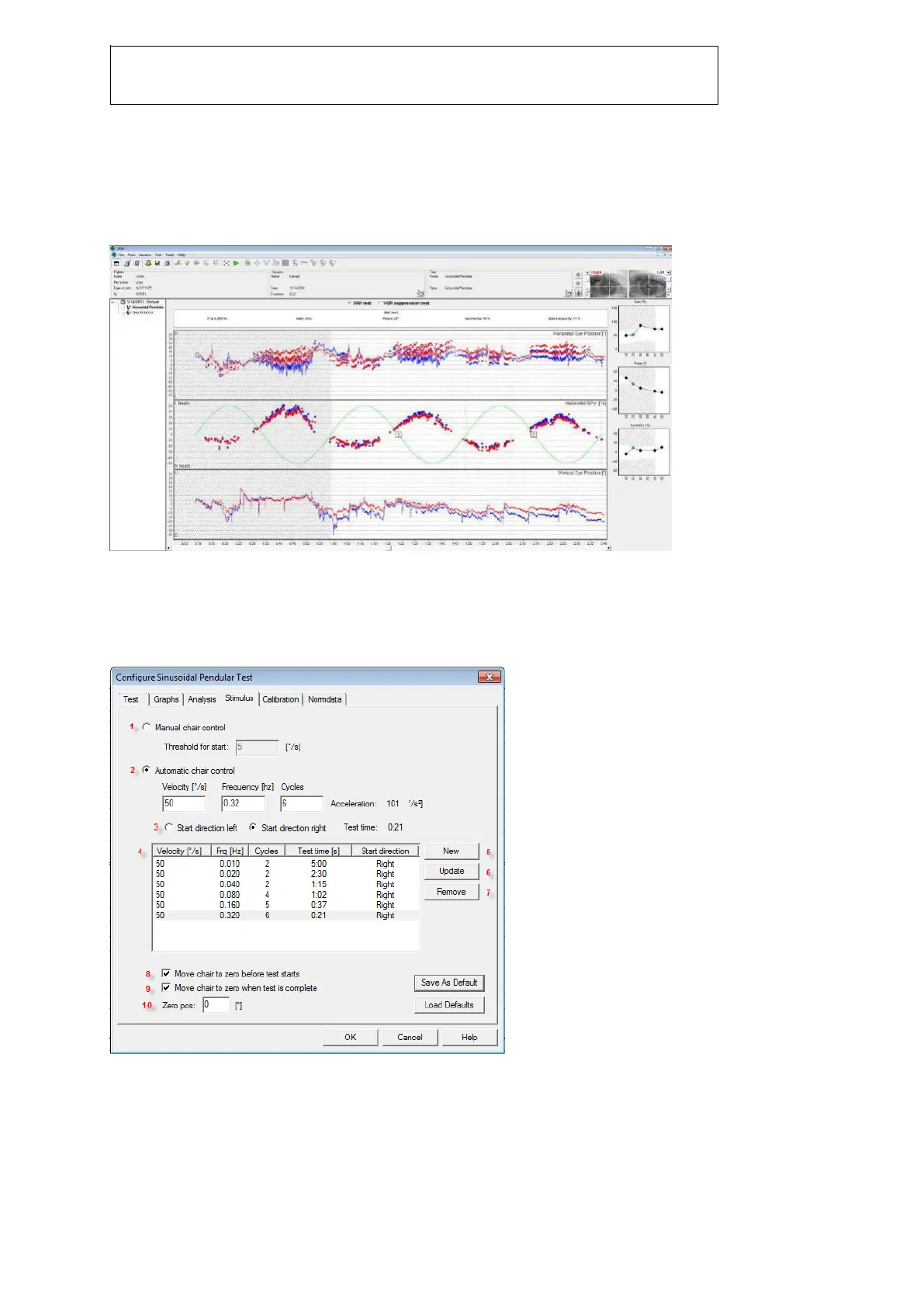 stimulus parameters will be displayed, including velocity (°/s), frequency (Hz), cycles, test time