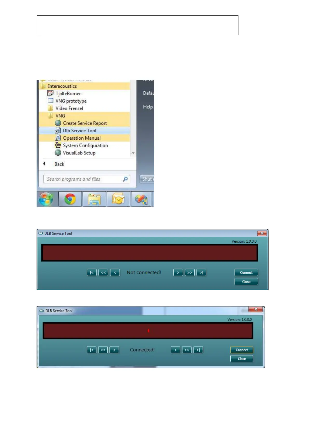 Programme)->Interacoustics->VNG und wählen “DLB Service Tool” (DLB Wartungswerkzeug). Zuvor