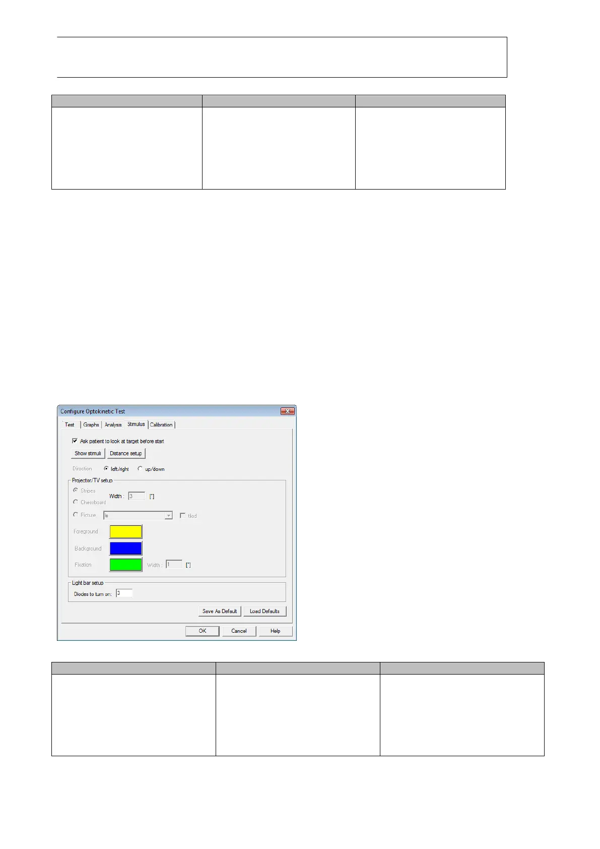 O diálogo de configuração dos estímulos é idêntico ao teste de gaze. Não é possível ativar um teste de