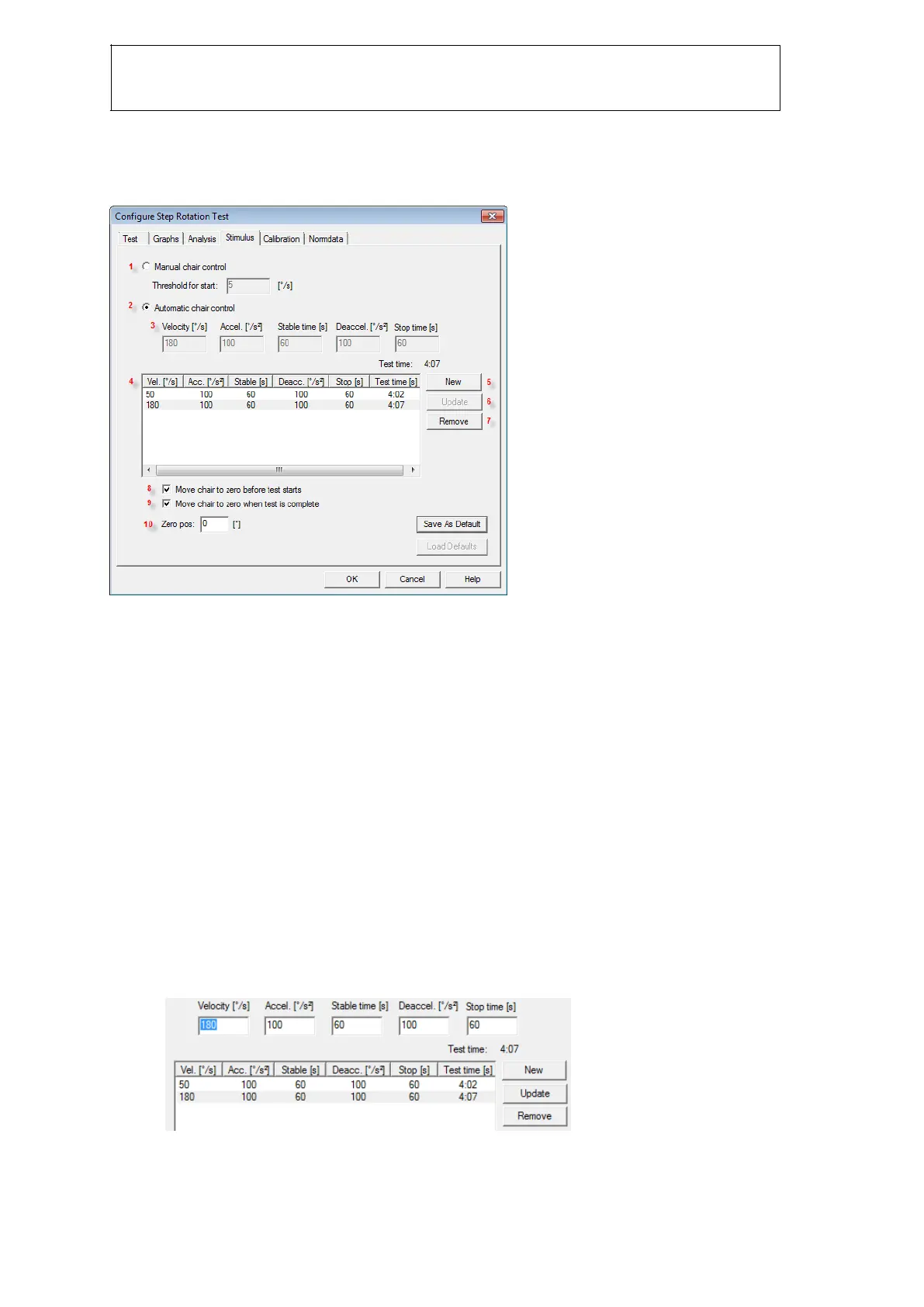 Para configurar la prueba rotatoria impulsiva, abra la pestaña "Stimulus" (Estímulo) del cuadro de