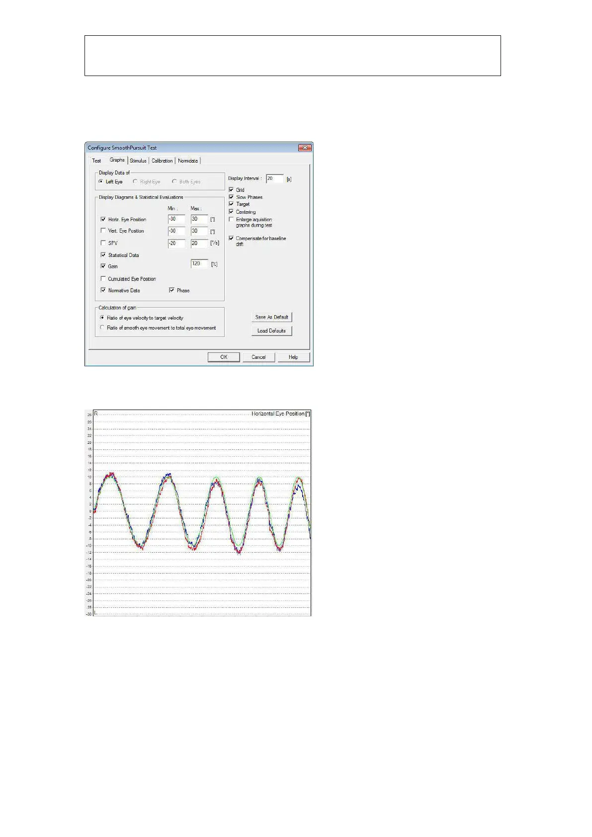Pursuit Test->graph settings" (configurar prueba de seguimiento ocular->ajustes del gráfico) y