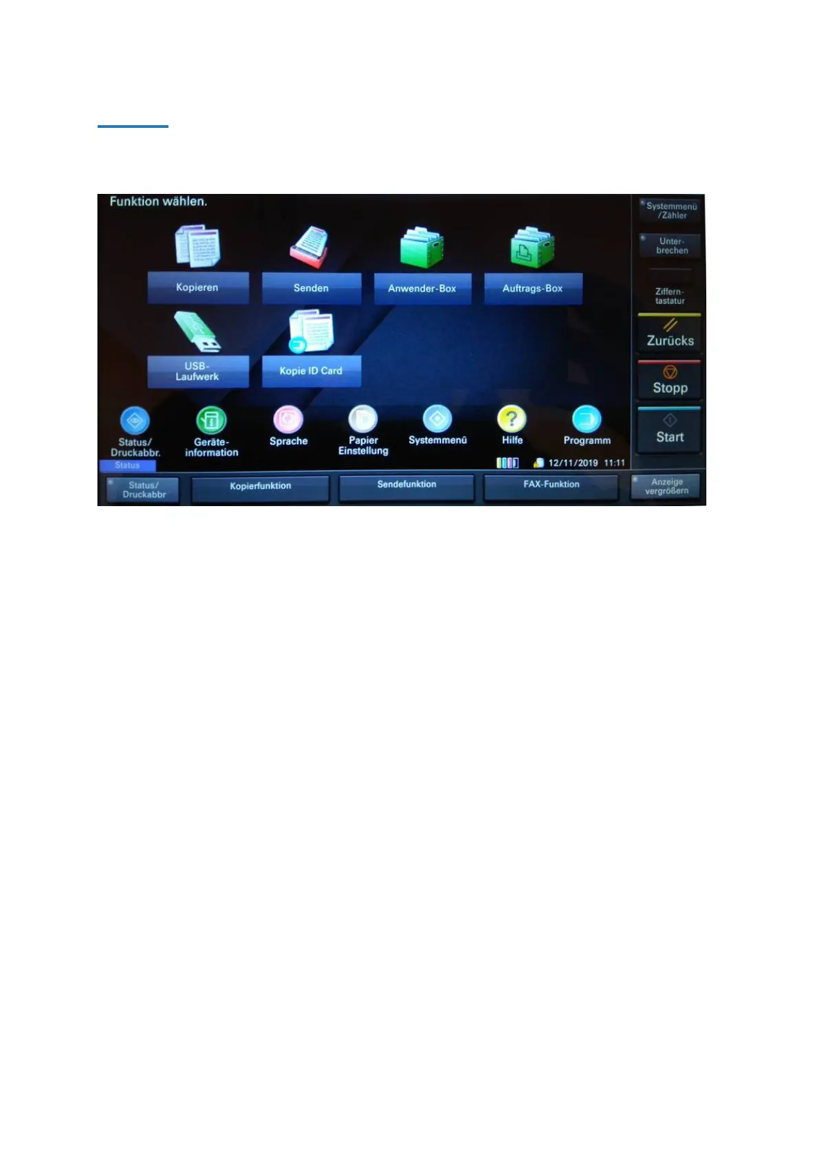 The copy functions screen should now be shown on the display of the printer.