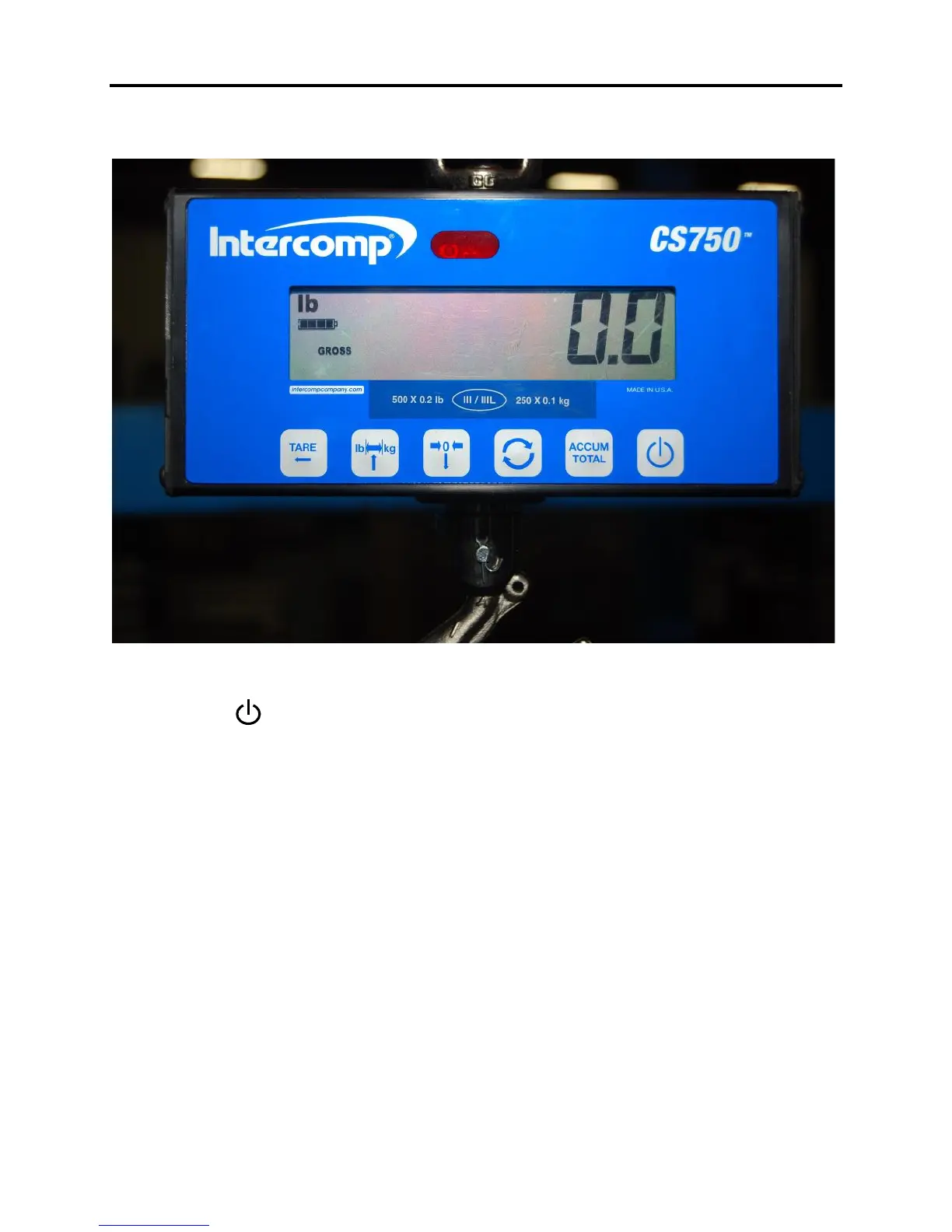 Press and hold the power button to apply power to the weighing system electronics.