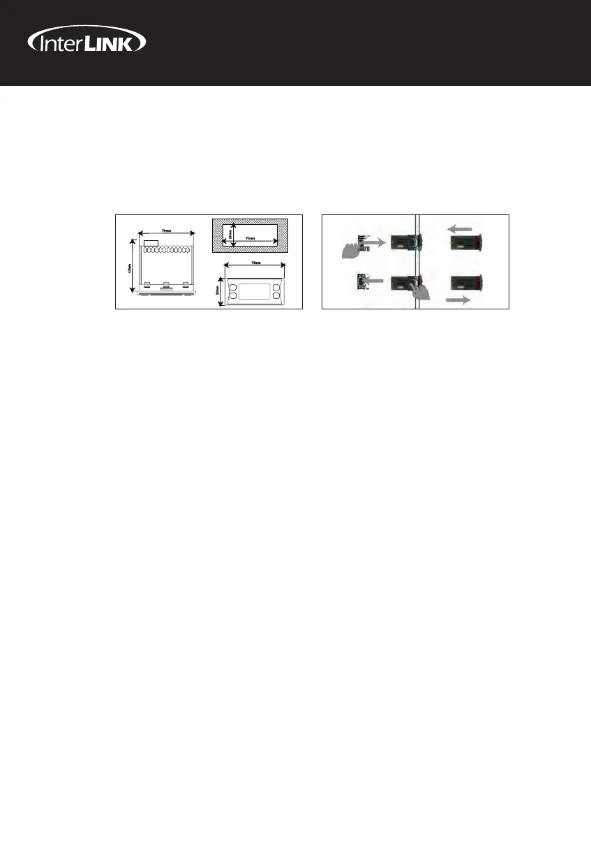 The instrument is designed for panel mounting. Make a hole of 29x71 mm, insert the instrument and fix it using the brackets provided. Do