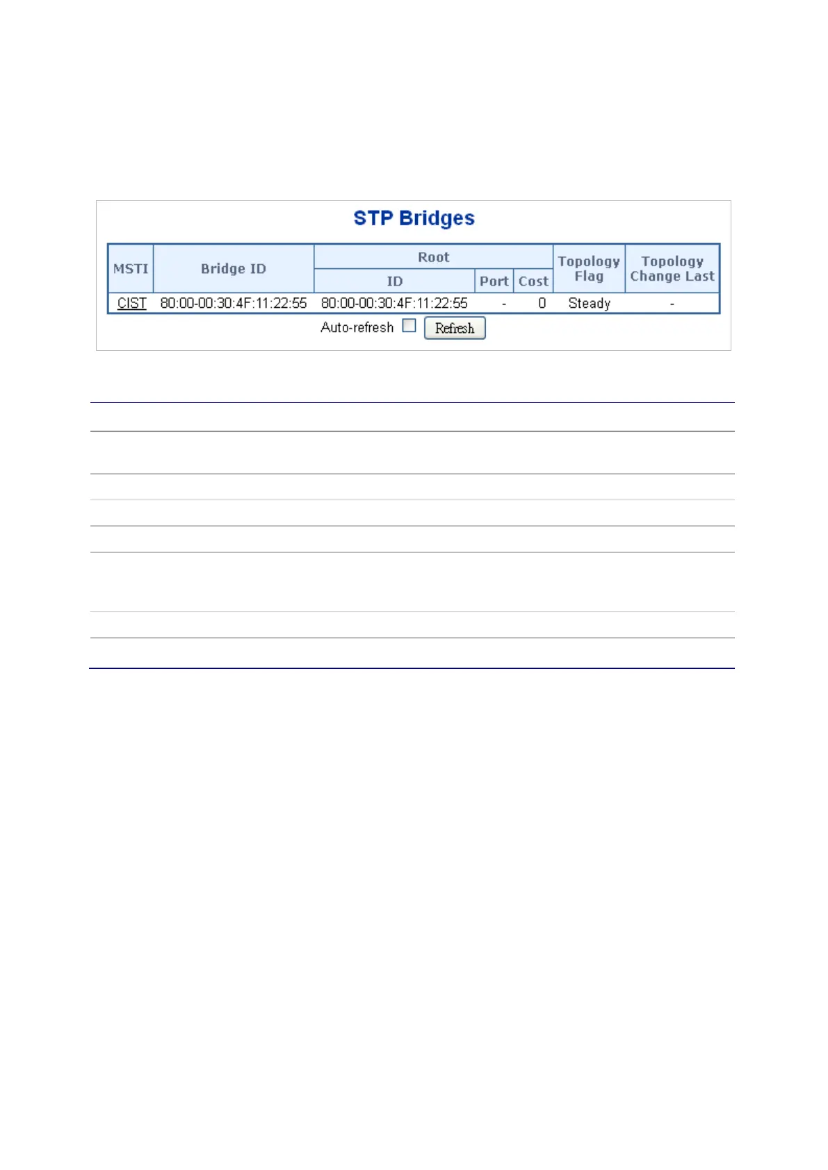 table contains a row for each STP bridge instance, and the columns display the