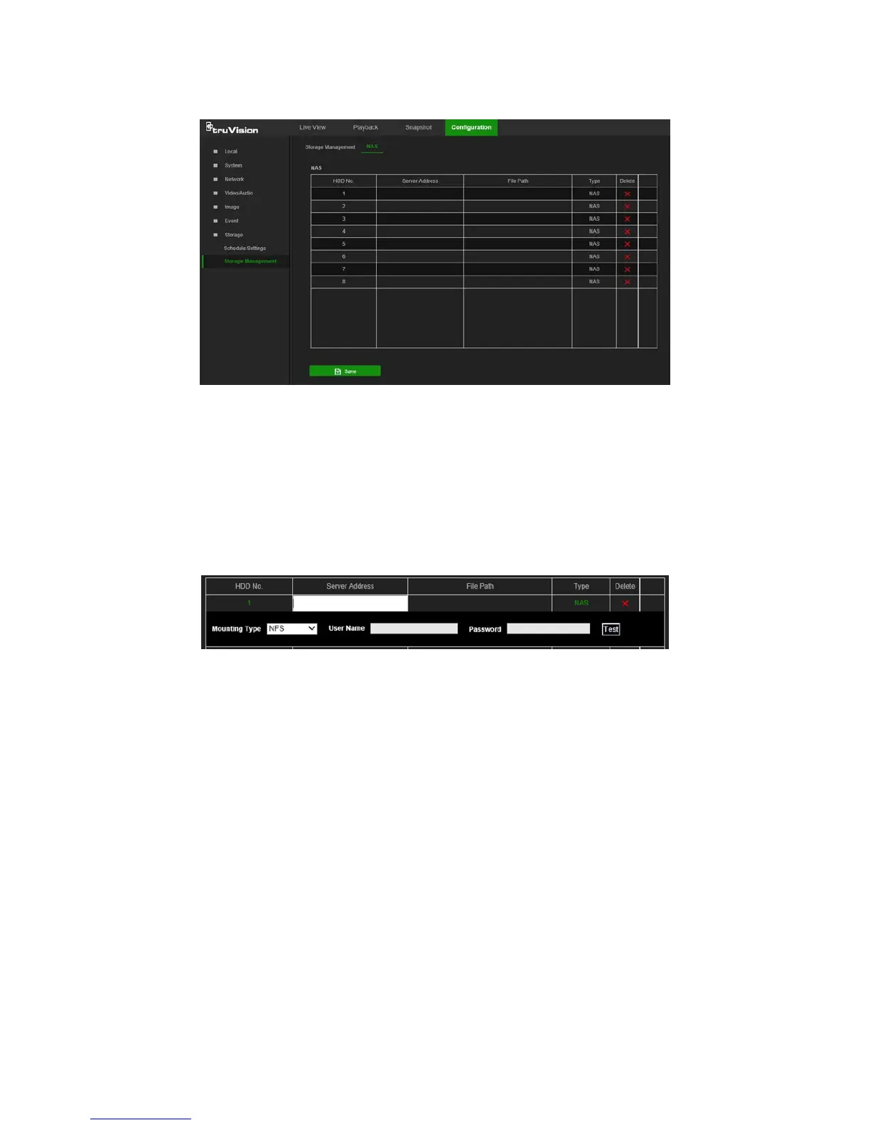 2. Click inside the NAS table to type the IP address and the file path of the network