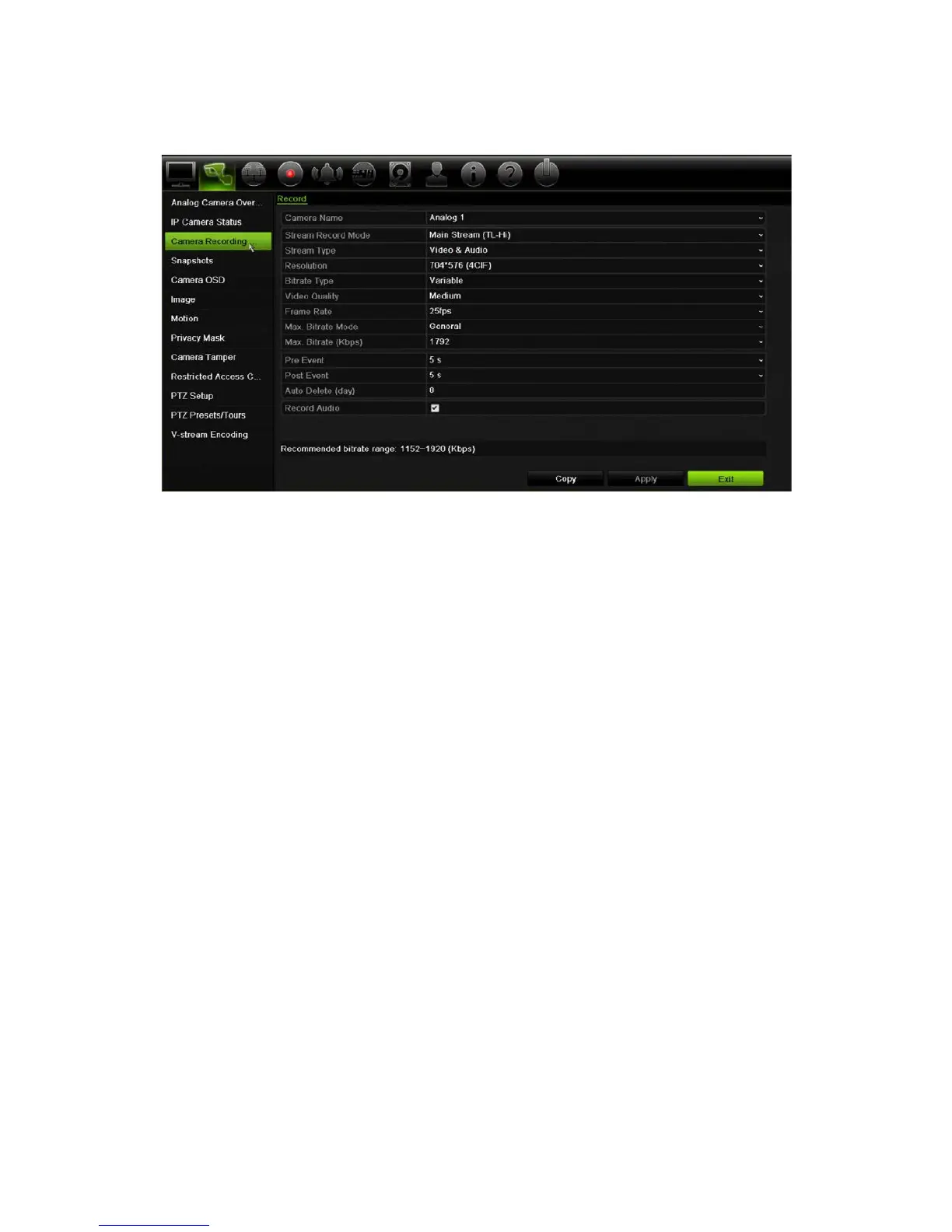 3. Configure the following recording settings (options available depend on the camera