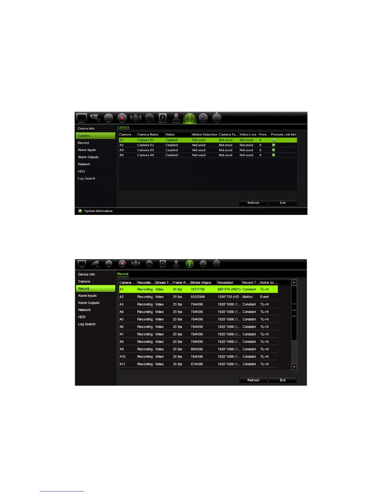 You can view the camera number, recording status, stream type, frame rate, bit rate