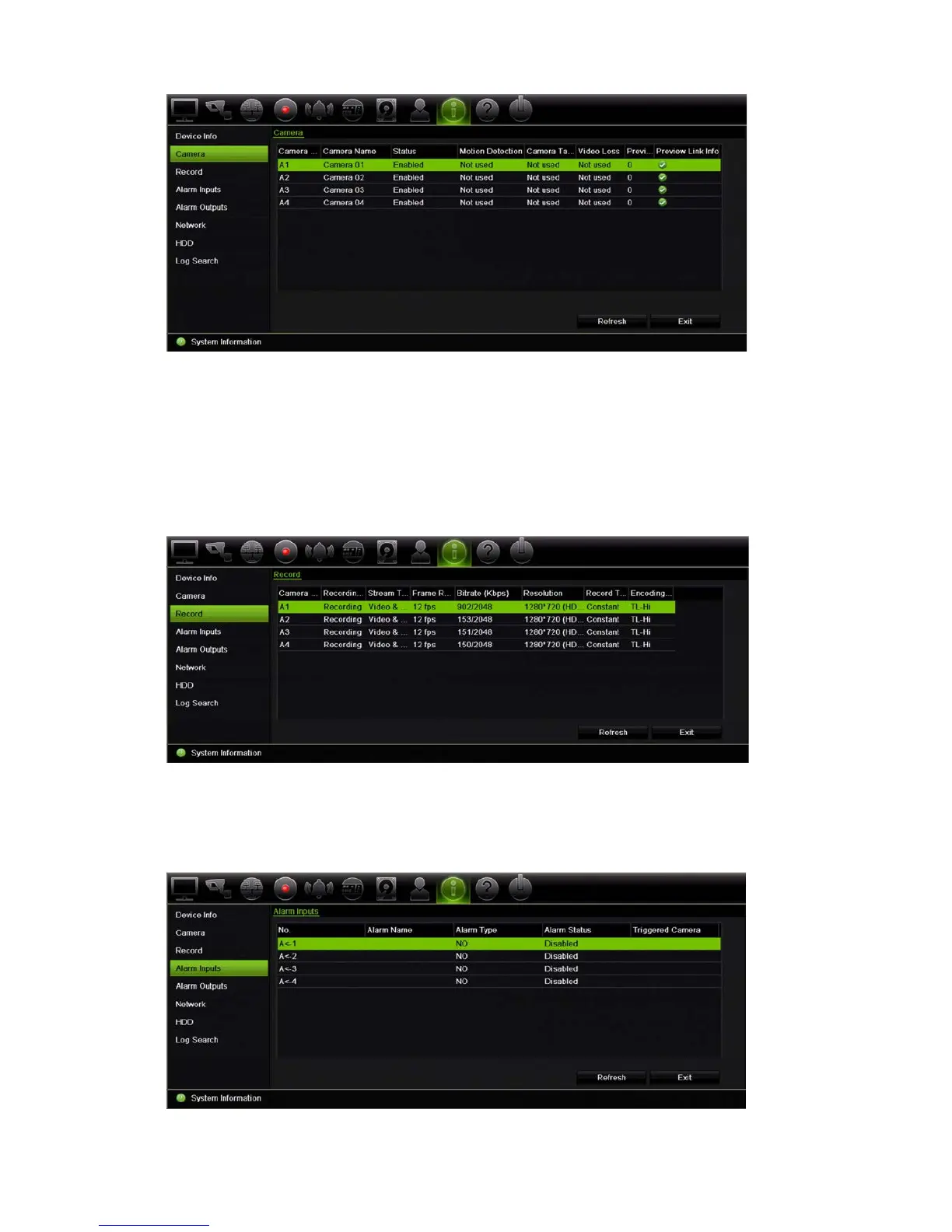 You can view the camera number, recording status, stream type, active frame rate, active