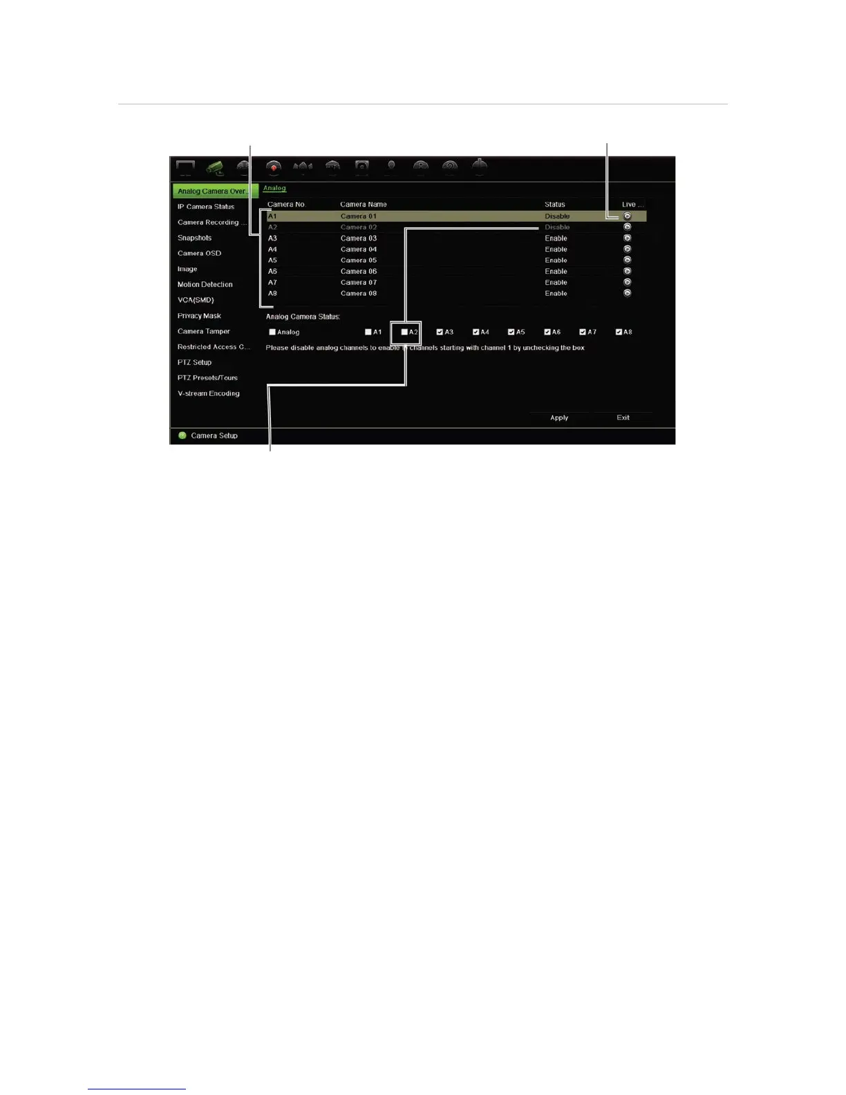2. In the Status section, check the boxes of the cameras that you want to enable. Uncheck