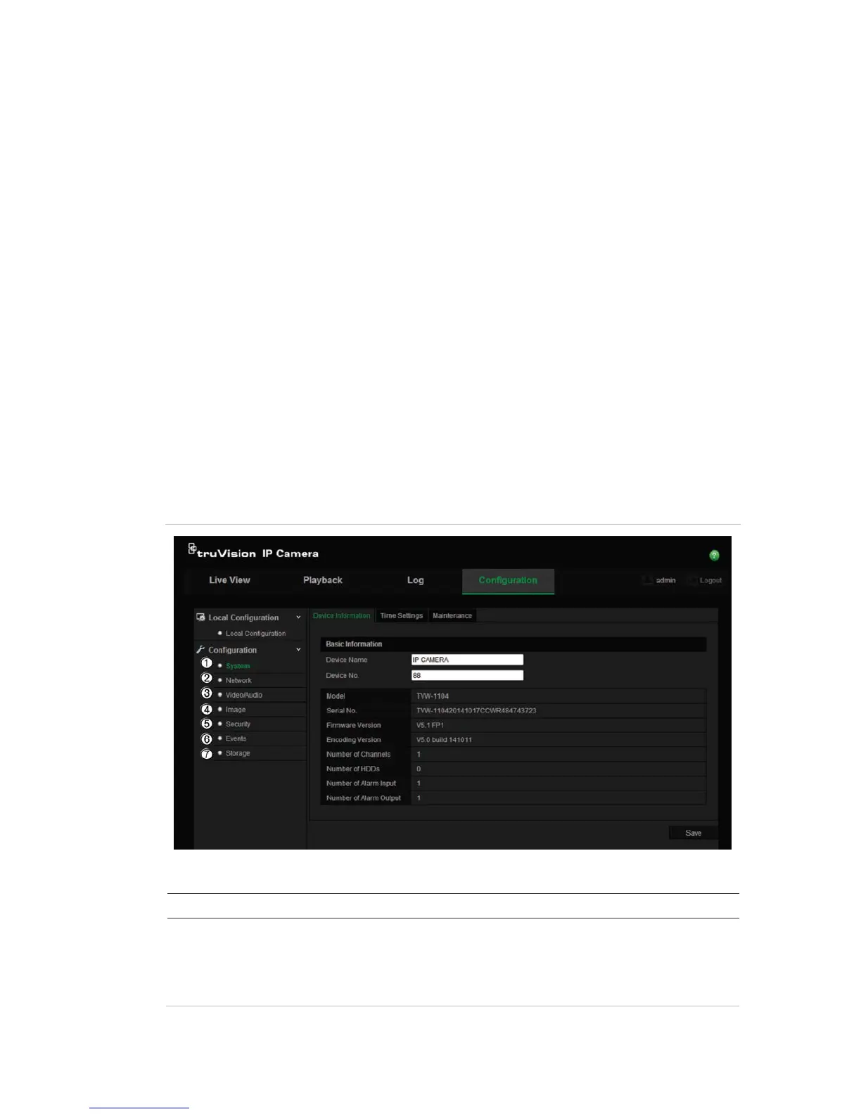 1. System Defines the camera name and number. Displays basic information on