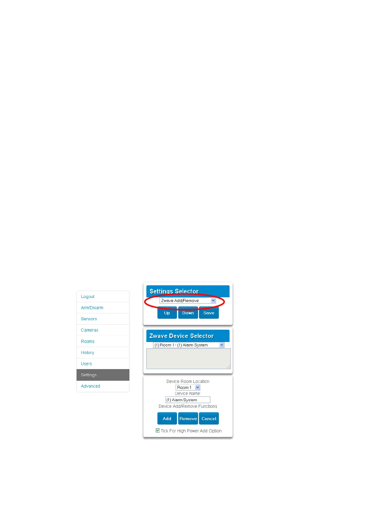 3. Click Settings > Z-Wave Add/Remove. Appropriate access level is required