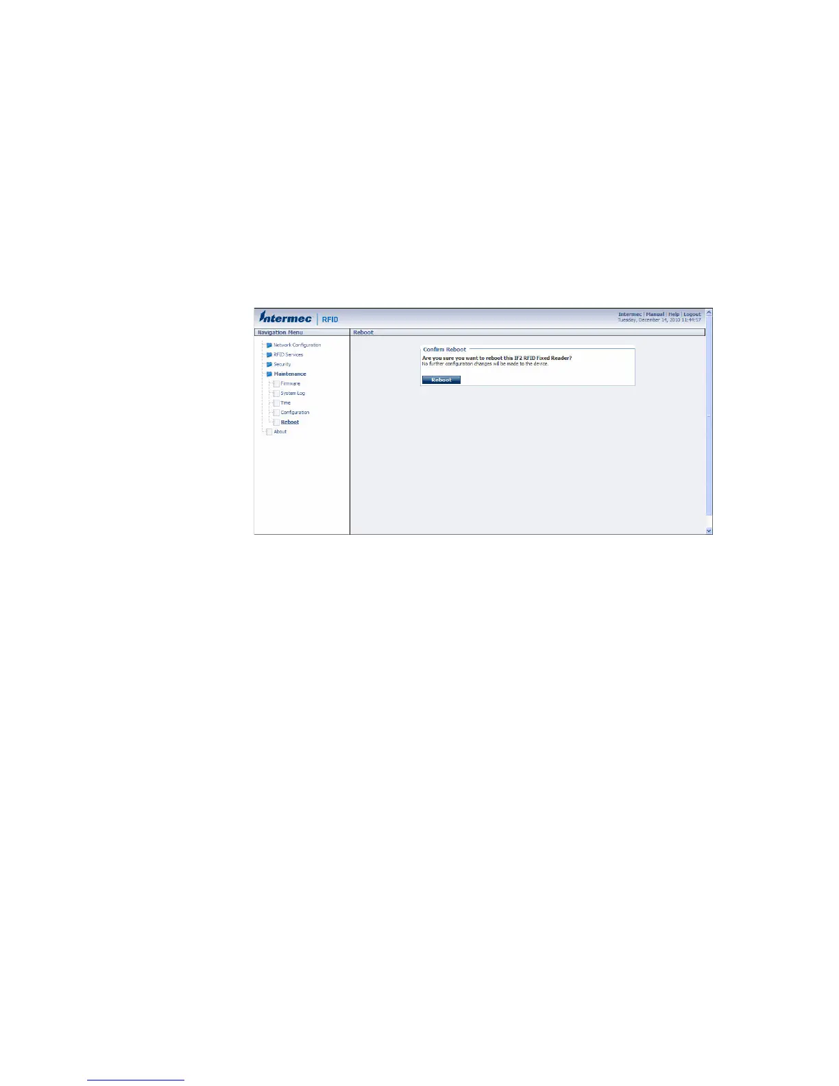 1 From the menu, click Maintenance > Reboot. The Reboot screen