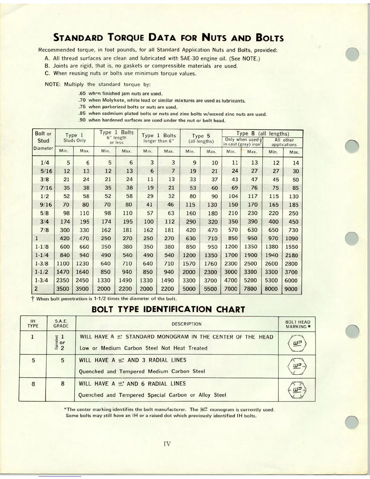 International 76 - Standard Torque Data; Torque Data for Nuts and Bolts; Bolt Type Identification