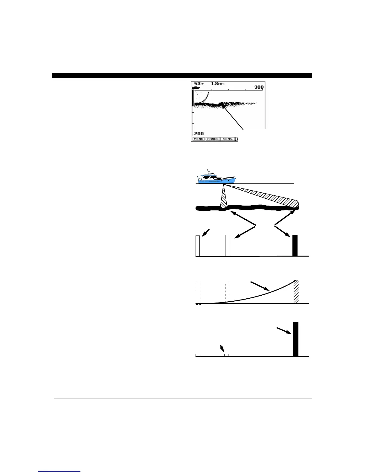 In the sketch, a boat is shown with the main transducer