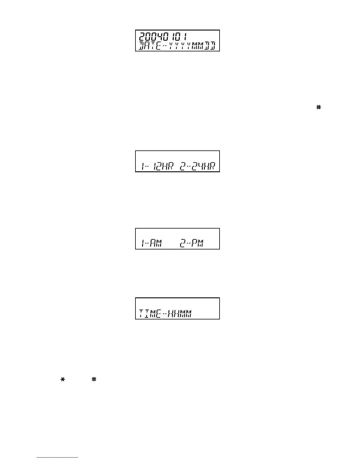 6. Press 1 for 12 hour mode or 2 for 24 hour mode display (if 24 hour mode was chosen, please go to