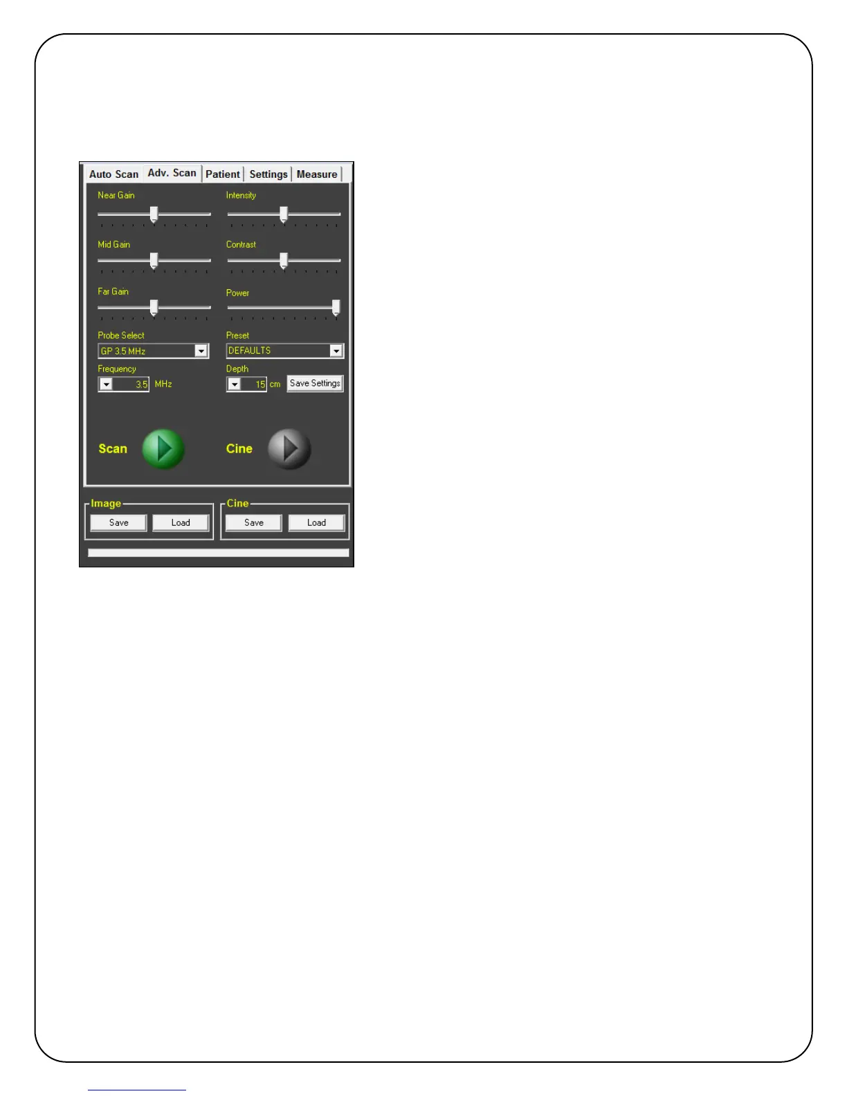 The Adv. Scan tab provides the complete ultrasound controls. This tab is typically only used if