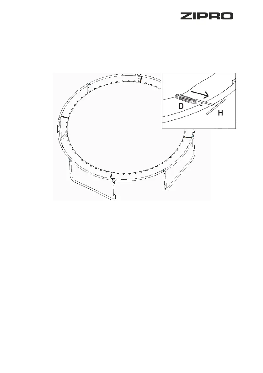 įtempkite įrankiu (H). Vieną spyruoklės antgalį užkabinkite už šokinėjimo pagrindo, o kitą
